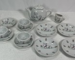 This is a 14-piece vintage miniature tea set made of porcelain, perfect for doll houses or Easter themes. The set features a cute bunny design and is suitable for various age groups including 3-4 years, 4-7, 8-11+ years and 17 years up. It is made in China and belongs to the Character Family of Bunny. This set is ideal for collectors and enthusiasts of vintage and antique toys.