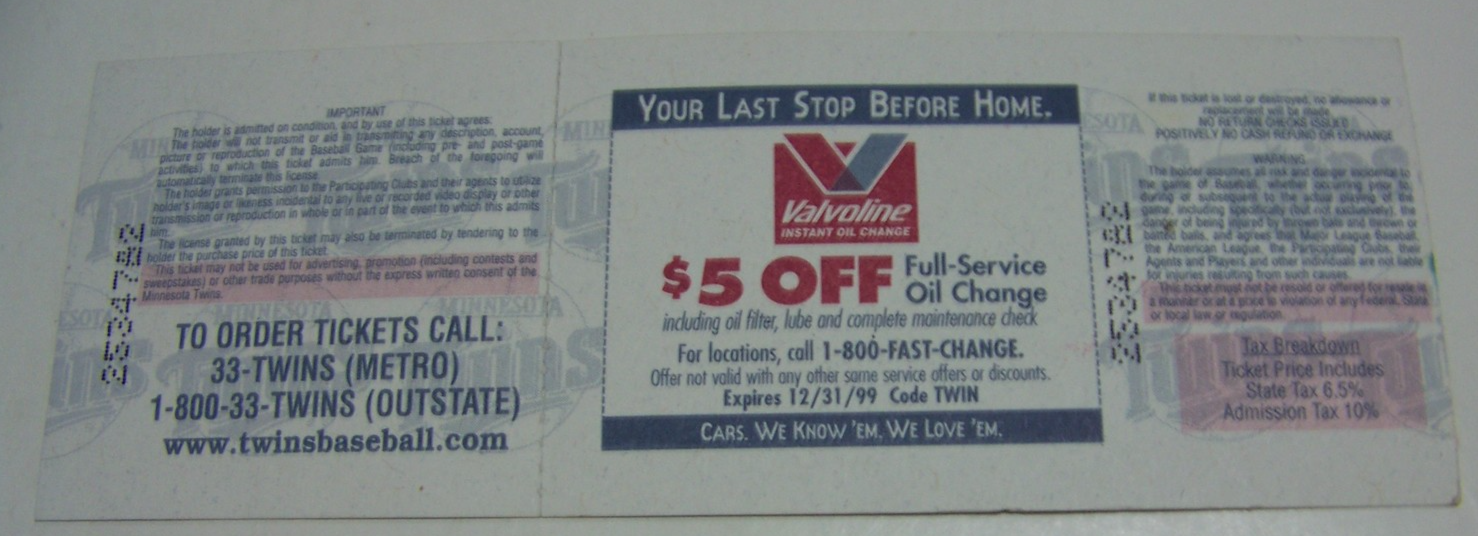 Minnesota Twins vs KC ROYALS 1999 unused Ticket Stub, FREE SHIPPING US ONLY!!