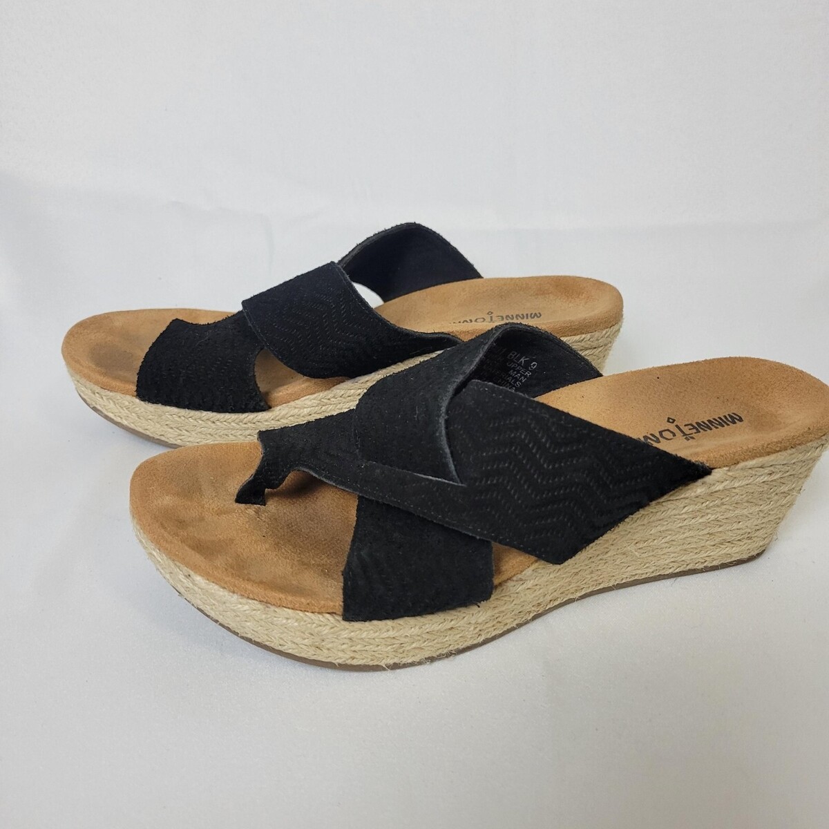 - Minnetonka Becka Suede Wedge Platform Toe Loop Sandals Black Leather Size 9