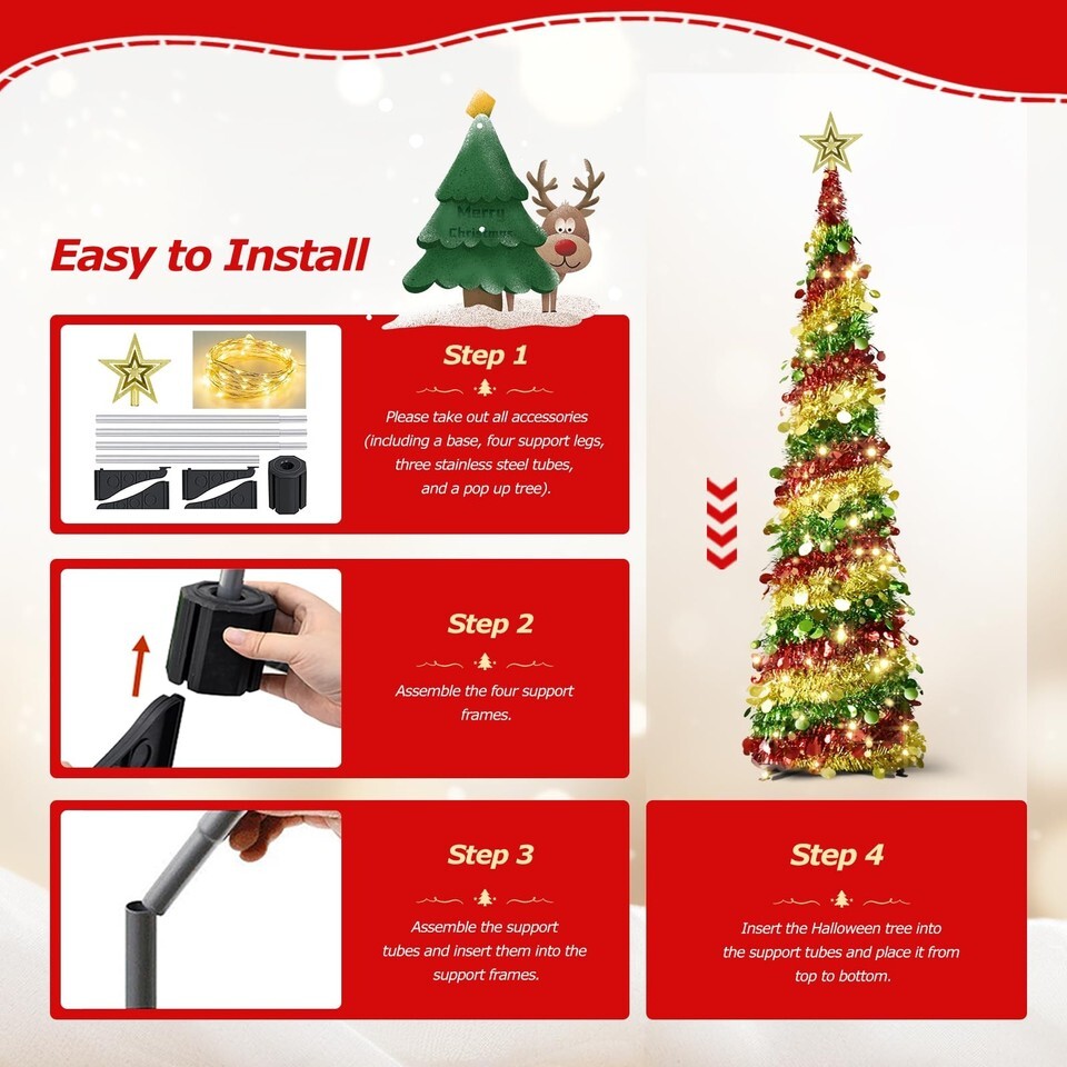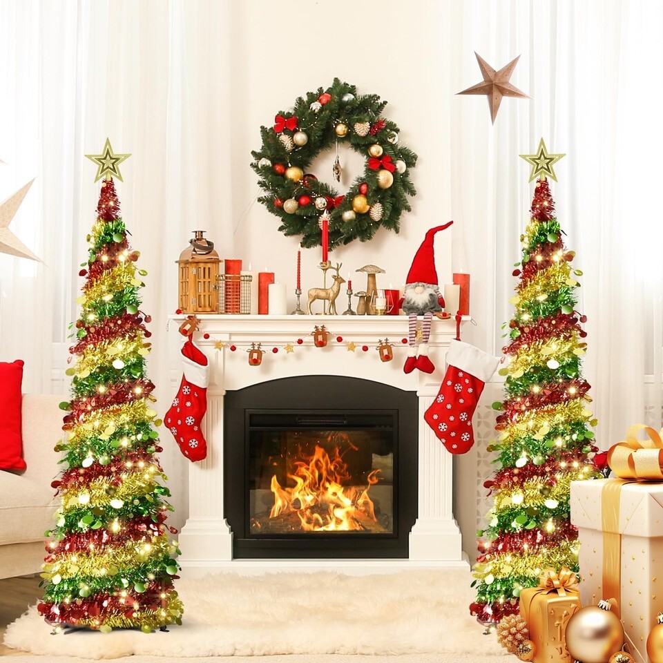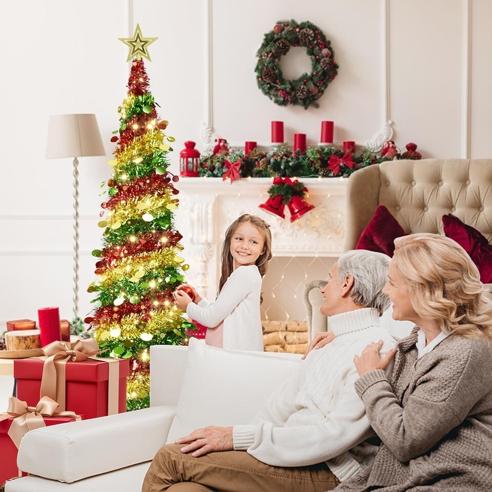 5 FT Pop Up Christmas Tree: This artificial lighted pop up Christmas tree features a tinsel design surrounded by soft, premium sequins, the set includes LED warm lights and a 3D tree-top star decoration to create a sparkling festive atmosphere