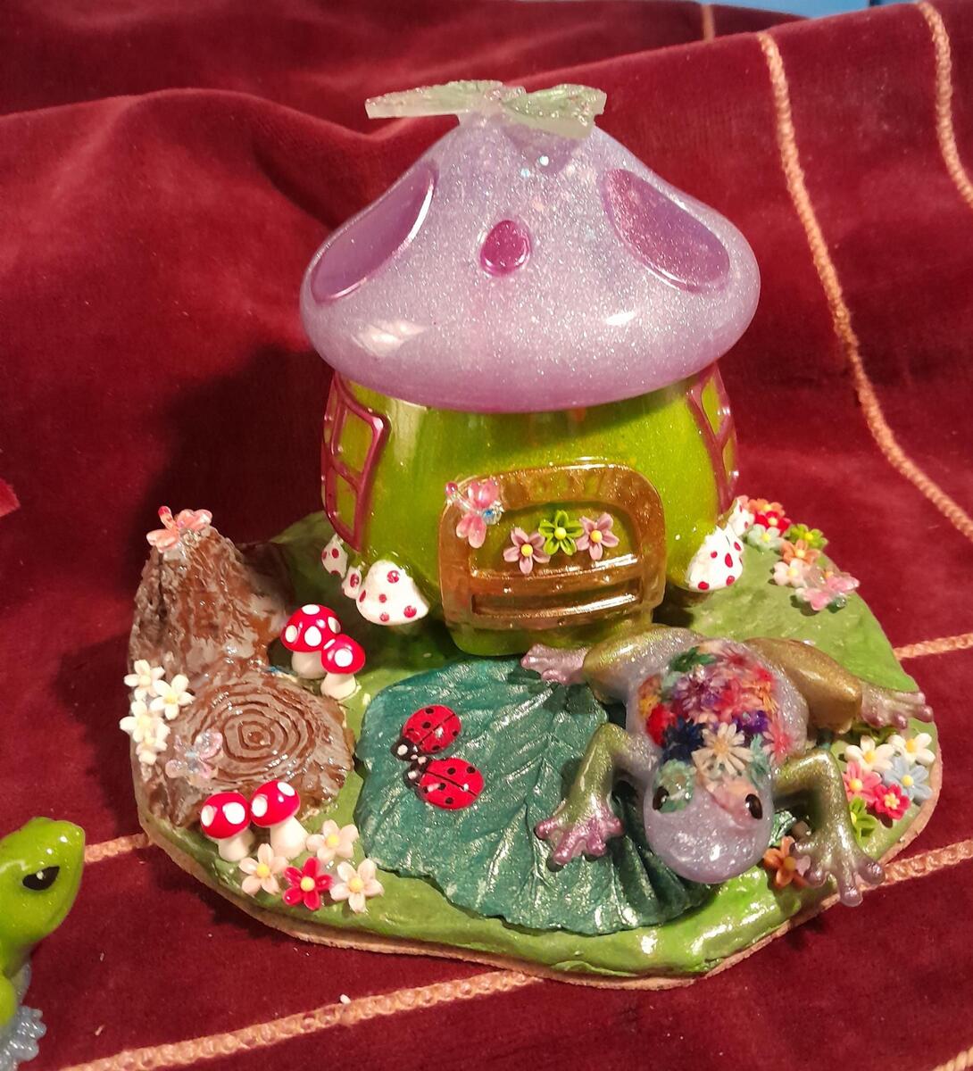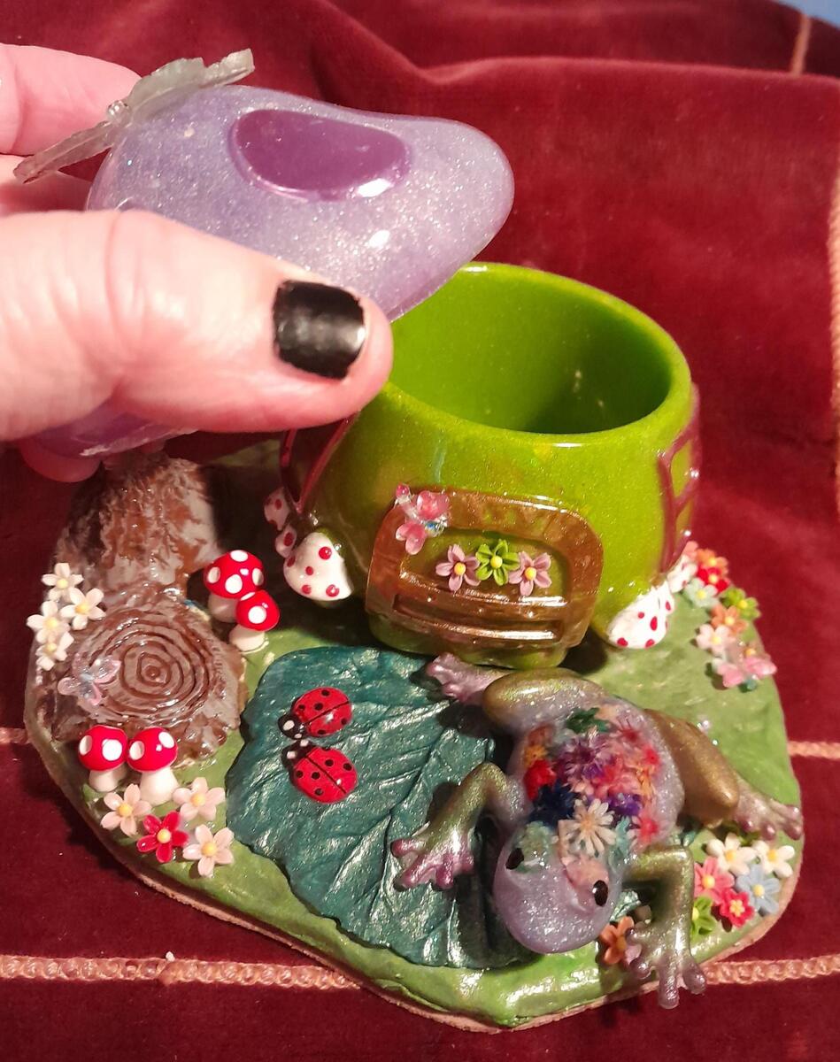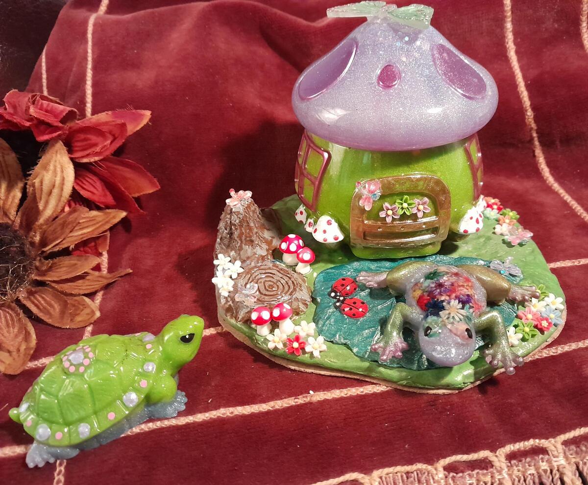 I had a lot of fun creating this one. Miss Lily's Pad is cleverly disguised as a Mushroom Trinket Box for all sorts of trinkets and treasures, but is also Miss Lily's home. Her Pad, don'tcha know. ;-) Towanda, her Turtle friend who lives in the creek closeby, has dropped by for a visit.