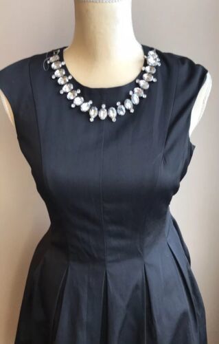 This is an adorable fit flare dress which will be great for your holiday parties . Comes with a rhinestone necklace attached , Dress is lined and has side zip closure . New with tags fabric is polyester/ cotton