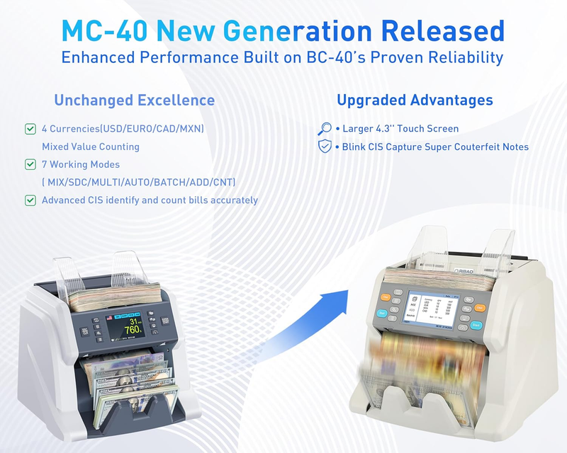 ?Blink CIS Upgrade?: Enhanced performance built on BC-40?s proven reliability,With UV, Magnetic sensor, Infrared sensor , and CIS, MC-40 equipped with blink CIS which will help you capture Super Couterfeit Notes accurately.