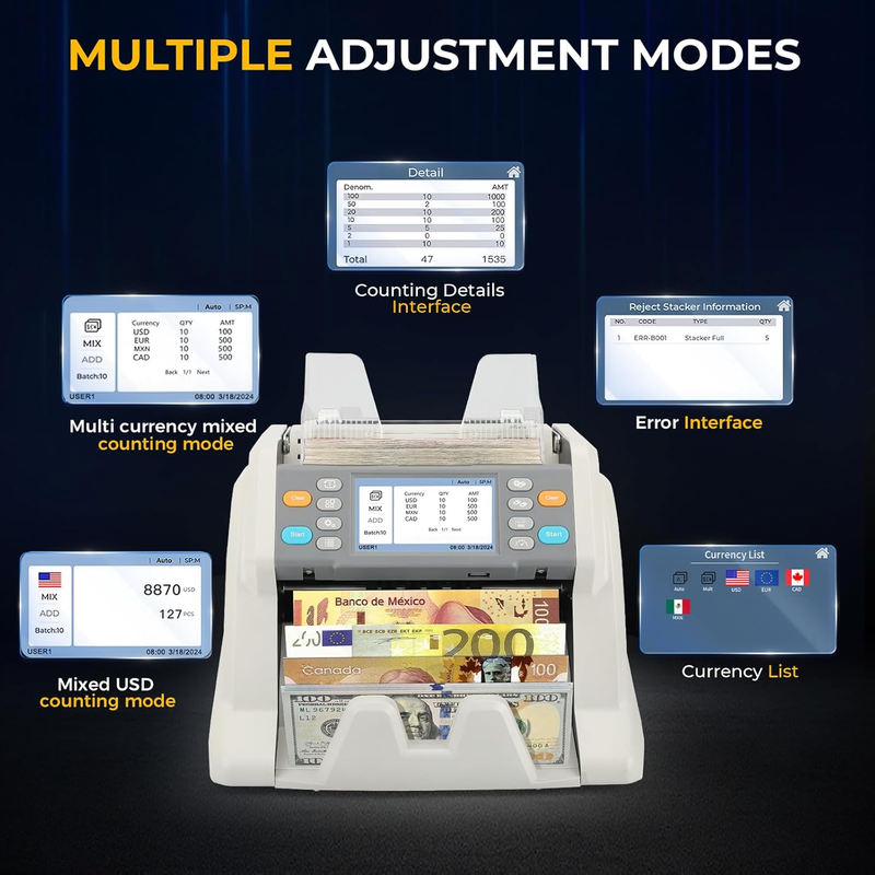 ?Various Working Modes?: Boost cash processing efficiency with features like mixed denomination counting, multi-currency support, auto currency recognition, SDC for manual sorting, high-speed counting (1500pcs/min), and batch processing.