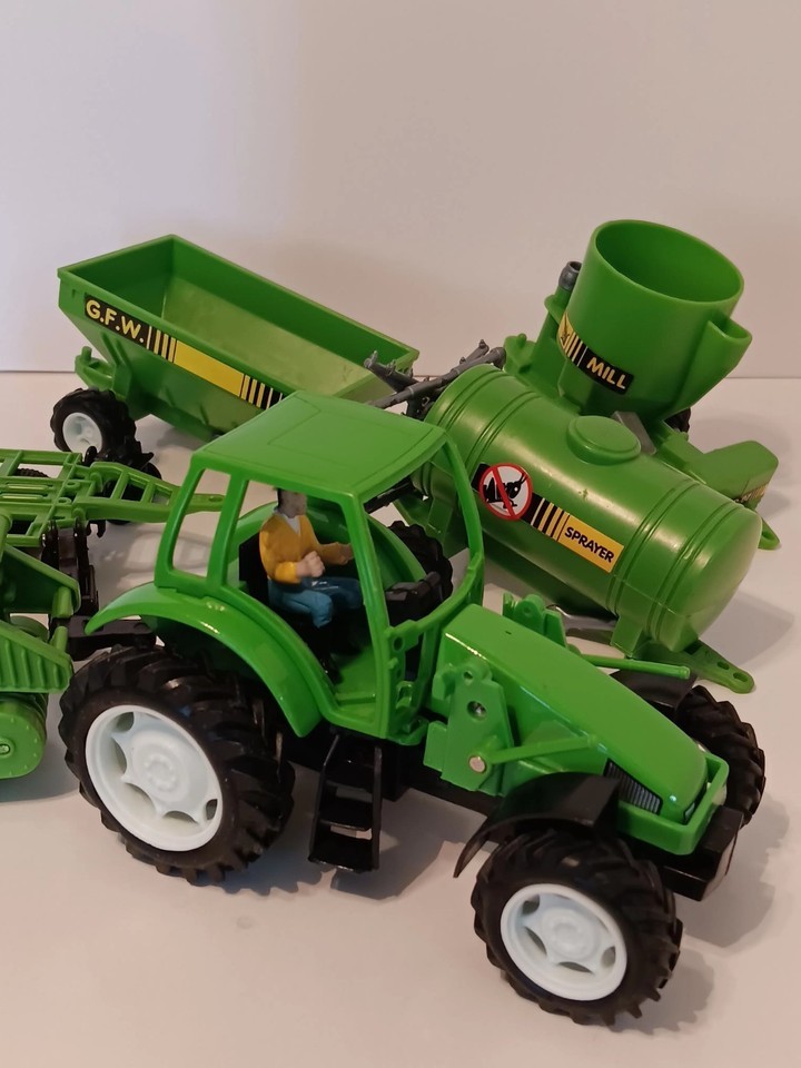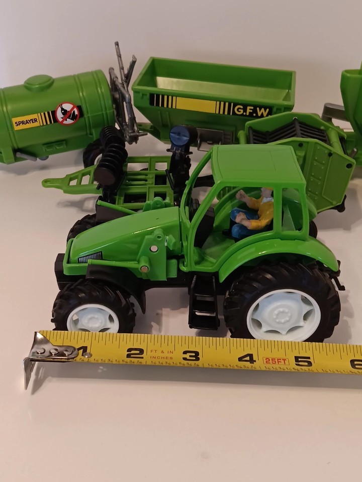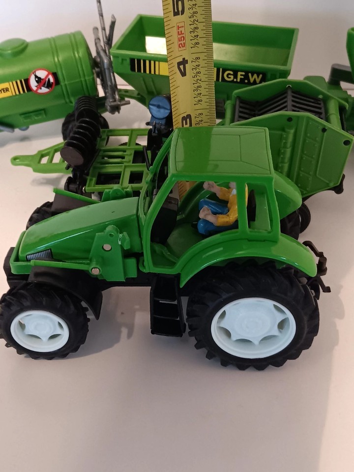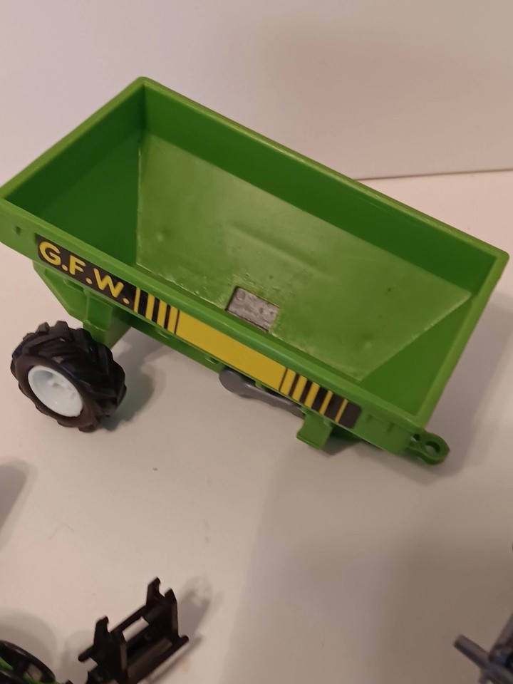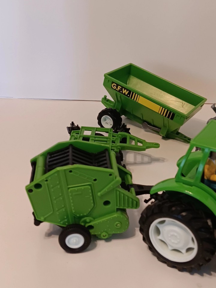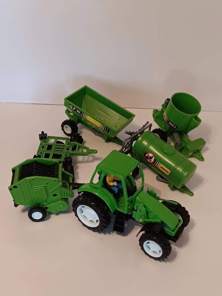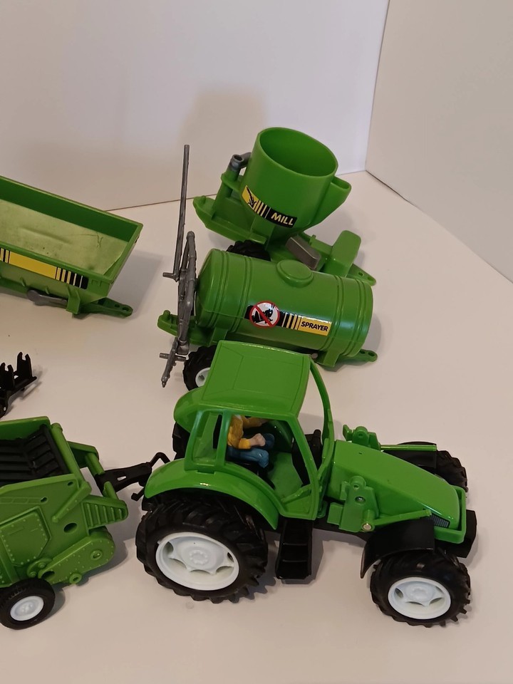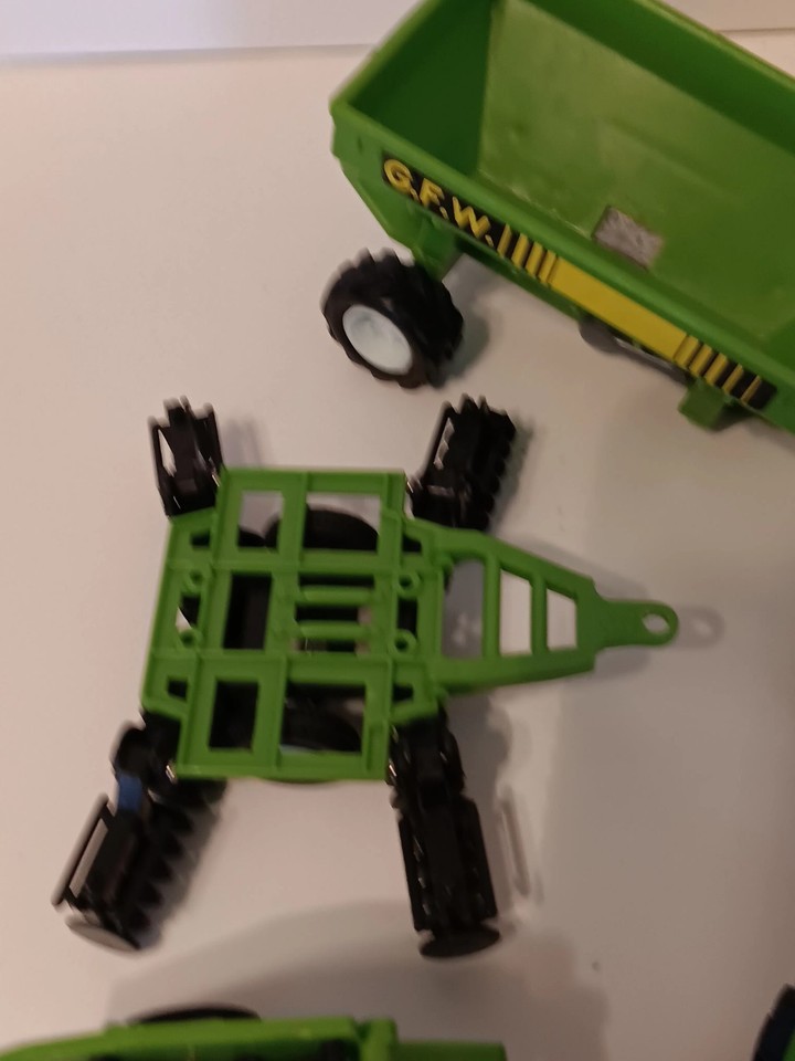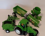 This is a mixed lot of 6 farm equipment toys, featuring toy trailers and a tractor in a farm theme. The tractor is made of diecast and plastic materials, while the trailers are made of plastic. The color of the vehicles is green, adding to the farm aesthetics of the set. The lot is described to have some damage and missing parts, which adds a realistic touch to the toy vehicles, making them suitable for farm play scenarios. Normal wear. See Pictures. All sizes are approximate.