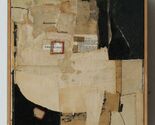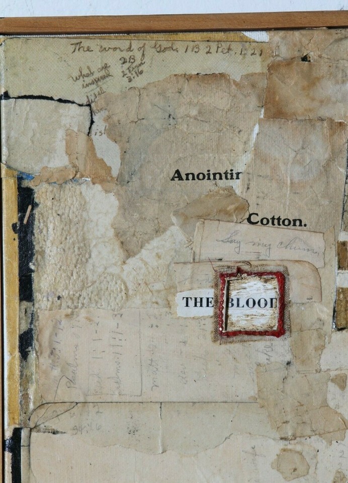 Features various elements (book pages, gauze, textile, hand-written notes, etc.) and paint on canvas