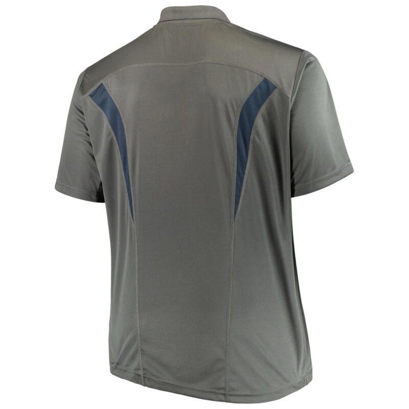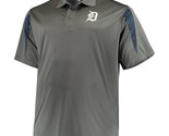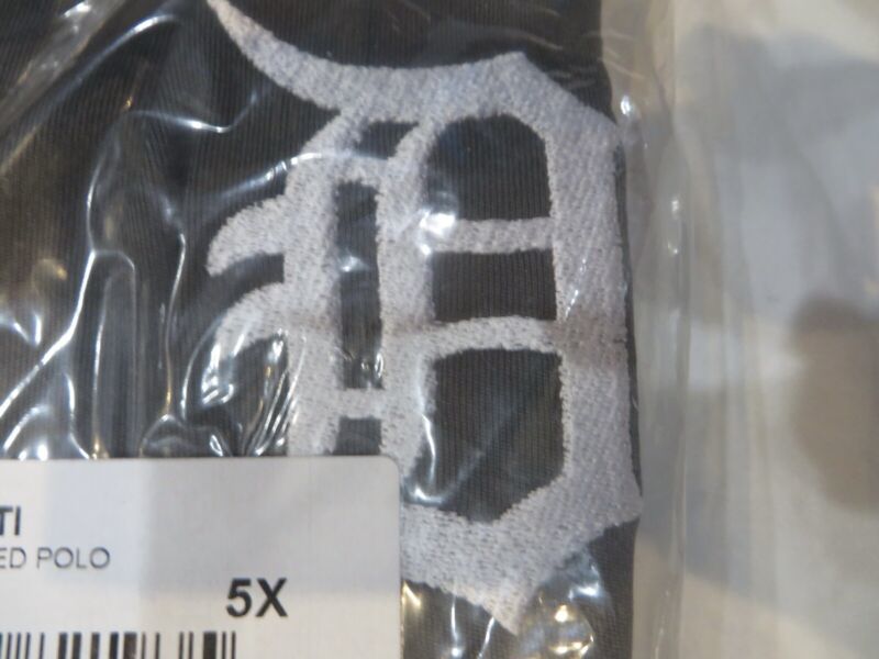 You are bidding on a new with tags Detroit polo shirt in adult size 5XL. The shirt is dark gray with a dark blue stripe on the arm and on the back. The shirt has a silvery white embroidered Detroit "D" on the left side. The shirt is by Majestic. It is 100% polyester. Great for any fan.