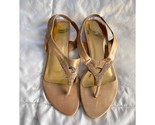 Elevate your summer footwear with these chic Mochi women?s sandals. Approximately a women?s size 7 (please refer to measurements) featuring a metallic gold/rose-gold finish with sparkling rhinestone embellishments on the T-strap. The thong style offers a casual-meets-dressy look perfect for warm weather outings, beach days, or evening wear. Flat sole keeps it comfortable. Gently worn ? see photos for wear details.