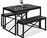 - Modern 3-Piece Dining Set - Metal Frame Black Wood Top Table and 2 Bench Chairs