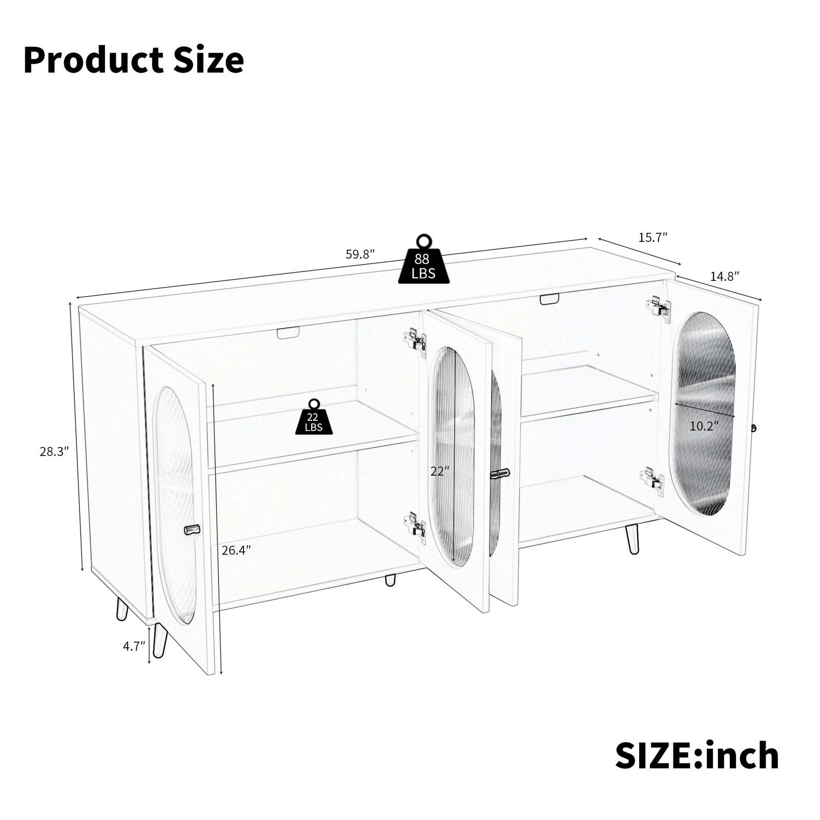 Large storage space: Partition storage design, large capacity, make the living room tidy and orderly. The sideboard has four closed big cabinets, the use of space is diverse. The shelf inside the door can be detached for fitting items of varied sizes.