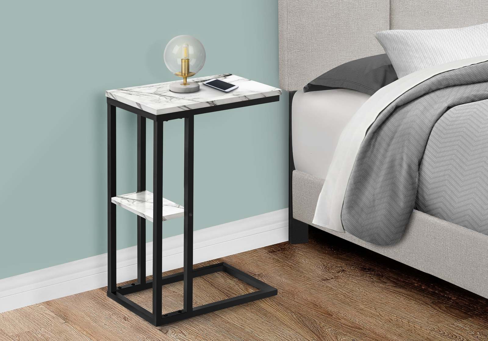 C-shaped accent table with a base that can be slid underneath sofas for convenience
