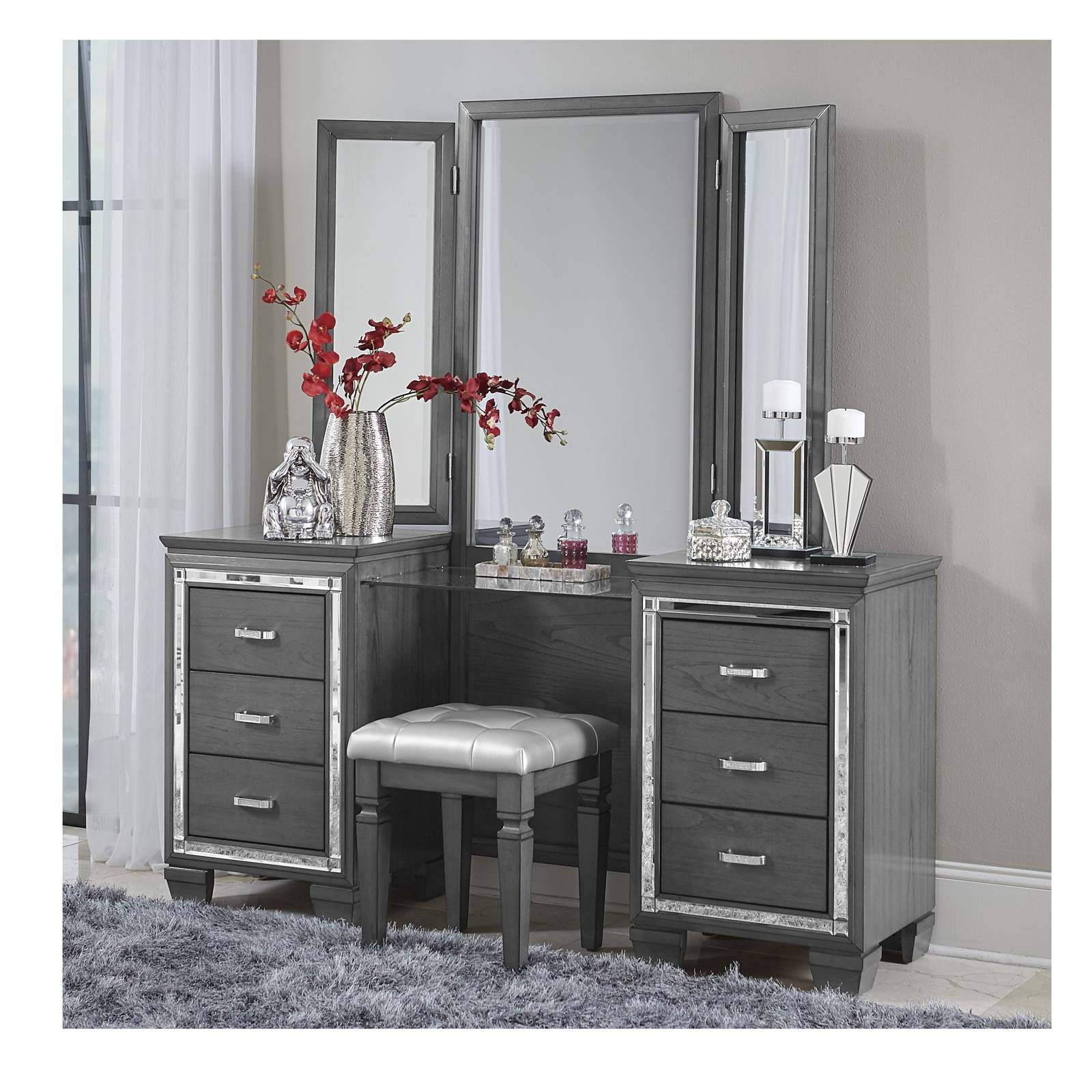 Glamour reigns in the design of the Allura Collection. Acrylic crystals center vanity stool?s tufted seat, reflecting the light to create eye-catching drama. The gray finish of the stool?s framing lends a classic touch to your bedroom?s decor.