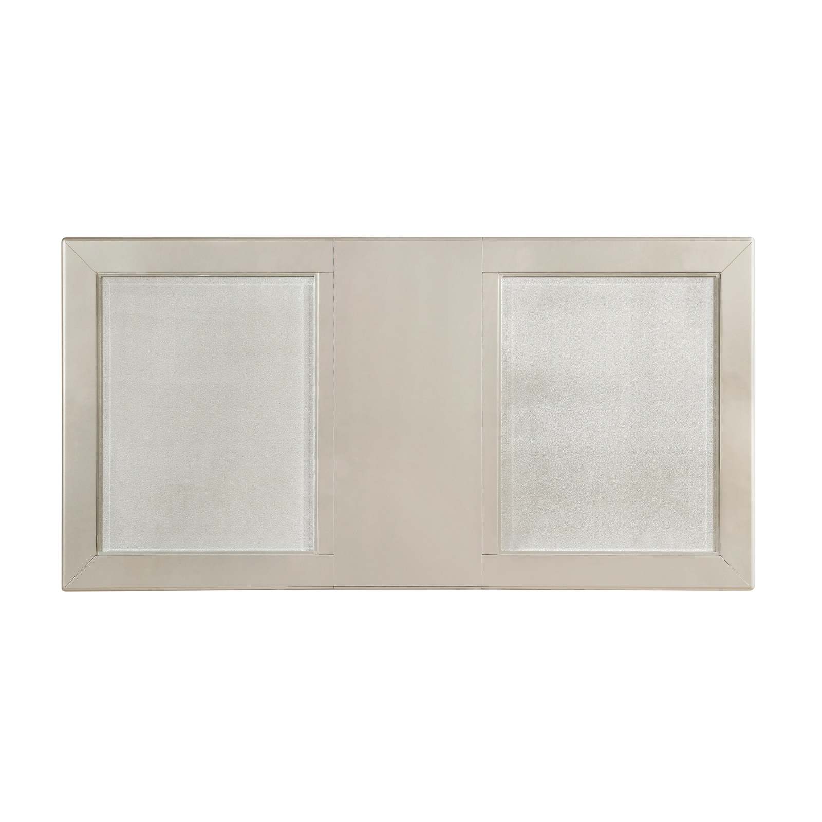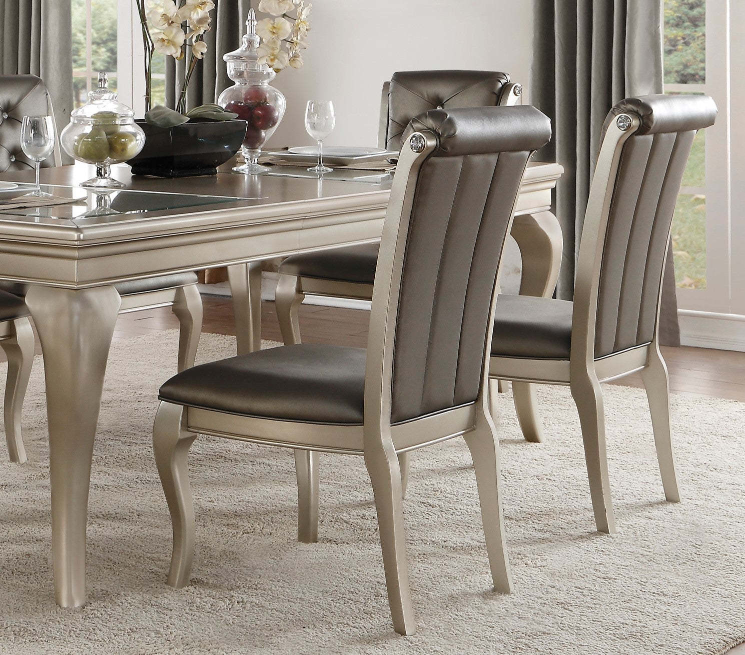 Blending traditional lines with modern glamour is the Crawford Collection. Finished in an eye-catching silver, the collection will be a dramatic addition to your homes dining room. Cabriole legs lend traditional accent to all pieces in the collection. Unique accenting abounds in this collection, the tabletop features inset glass panels and the chairs are enhanced with crystal button tufting.