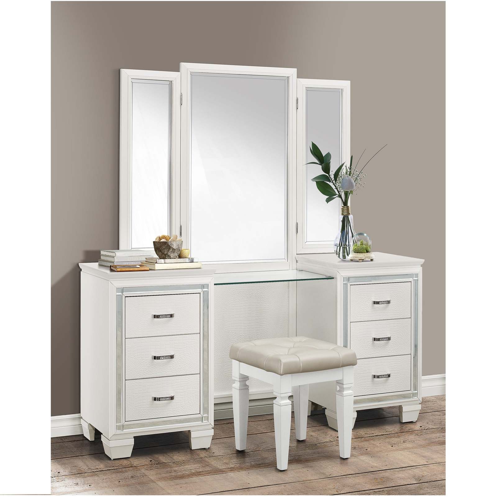 Glamour reigns in the design of the Allura Collection. Acrylic crystals center vanity stool?s tufted seat, reflecting the light to create eye-catching drama. The white finish of the stool?s framing lends a classic touch to your bedroom?s decor.