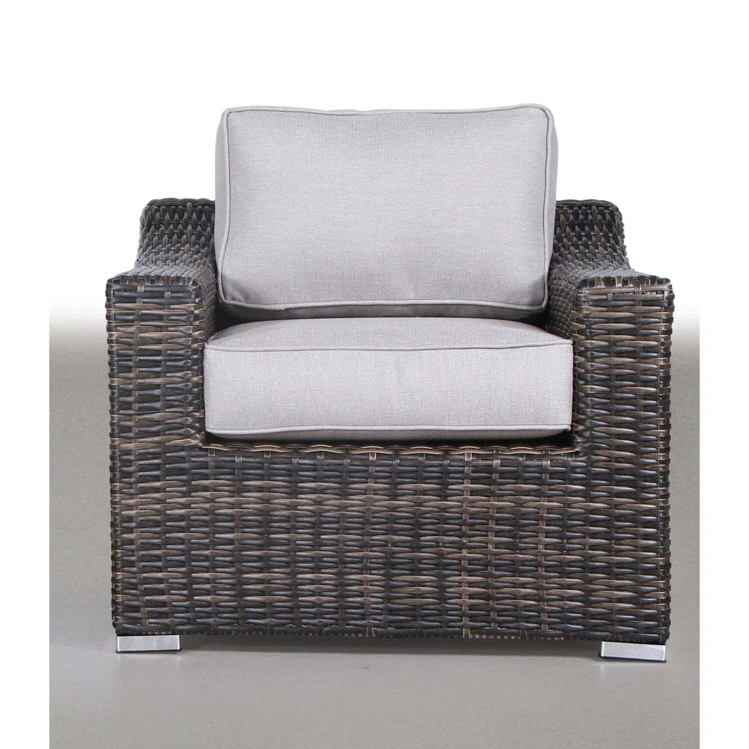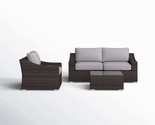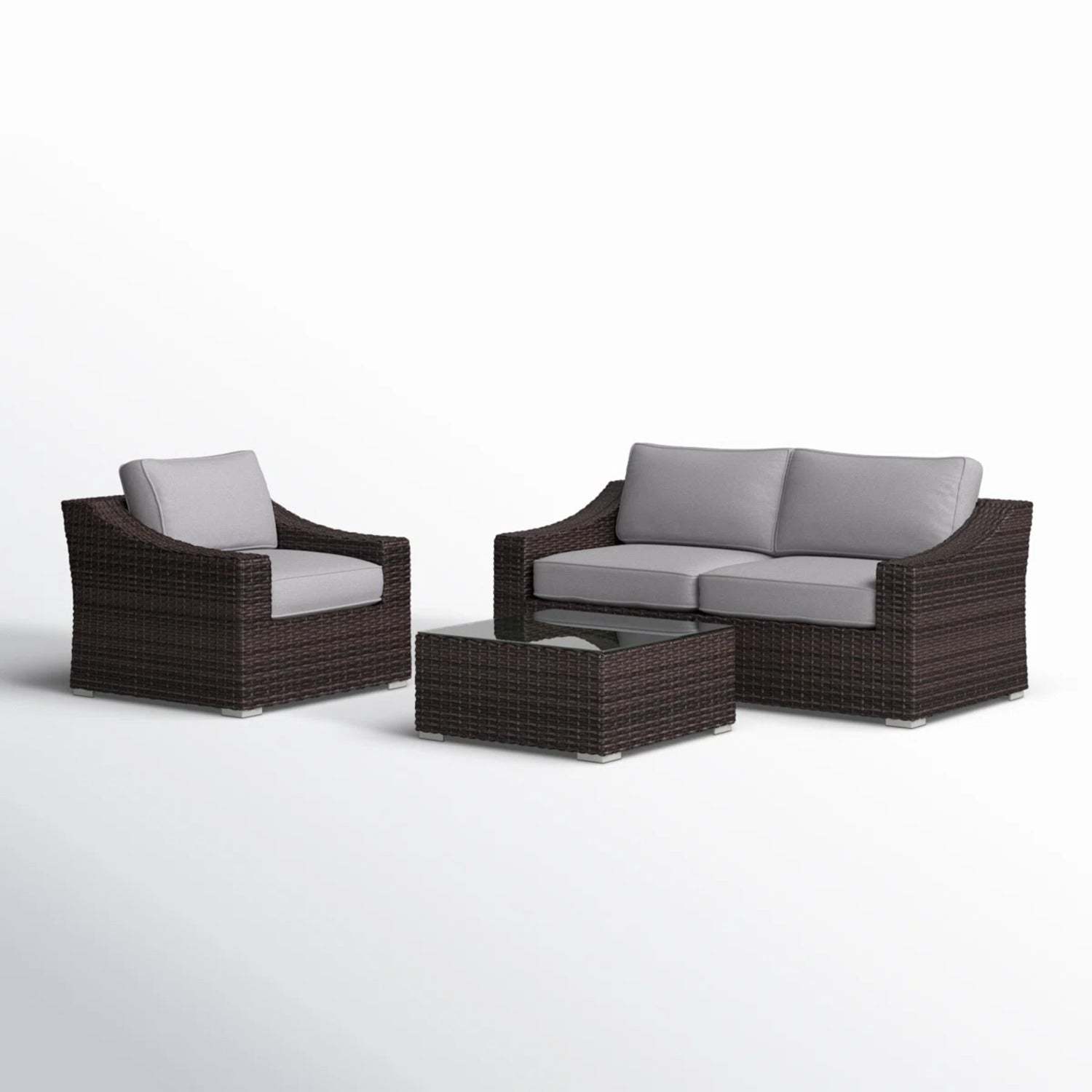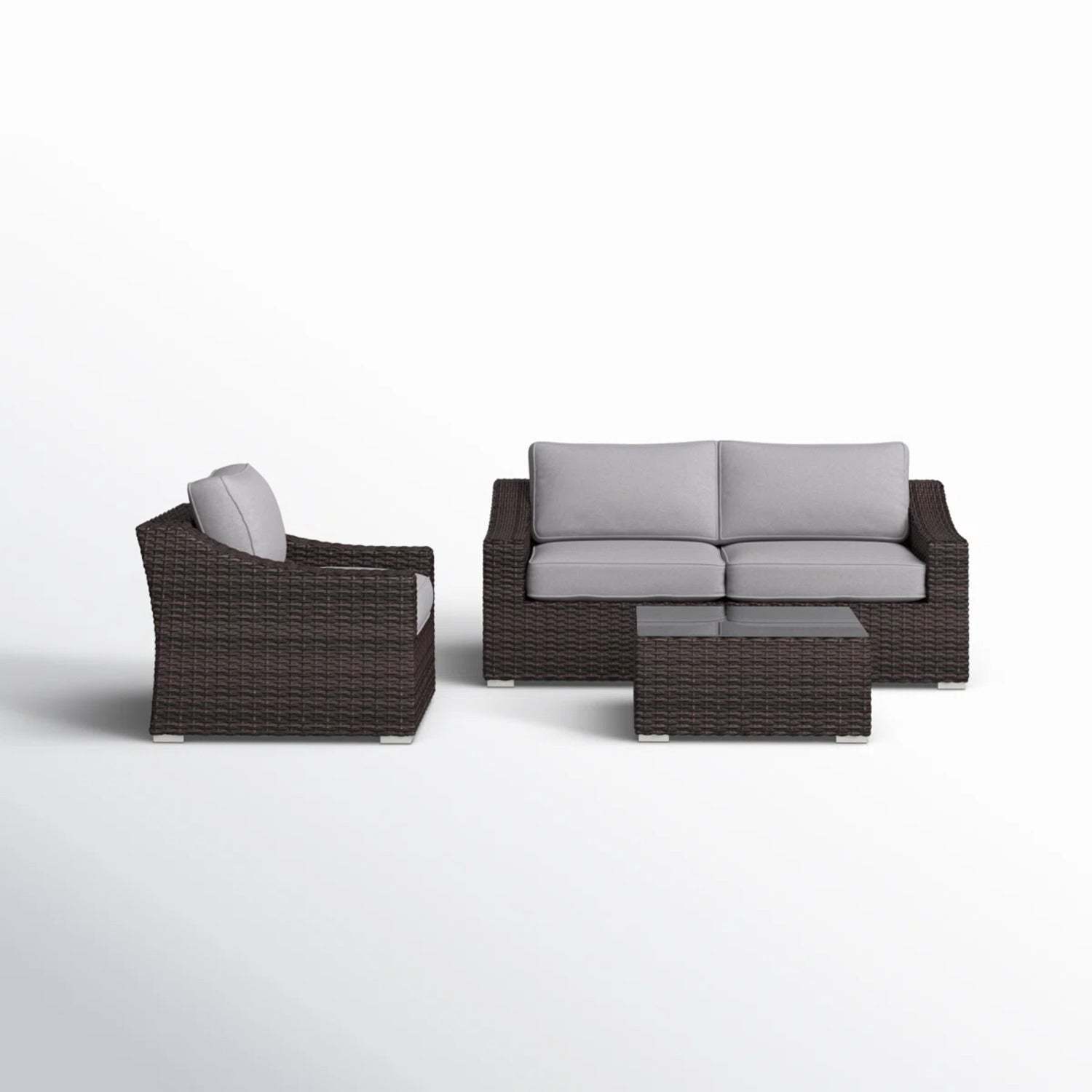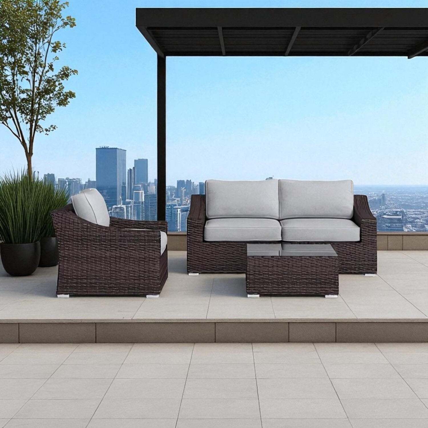 Add a touch of modern comfort to your outdoor space with this fully assembled 4-piece conversation set, perfect for patios, decks, or garden areas. The set includes a club chair, a loveseat made from two corner chairs, and a square glass-topped end table. Built with rustproof aluminum frames and wrapped in weather-resistant brown PE wicker, each piece is made to last through every season. Plush gray cushions, filled with high-resilience foam and covered in marine-grade olefin fabric, provide exceptional comfort and easy maintenance with zippered, machine-washable covers. Designed with gently sloped backs and commercial-grade durability, this set brings together timeless style and everyday ease?no assembly required.