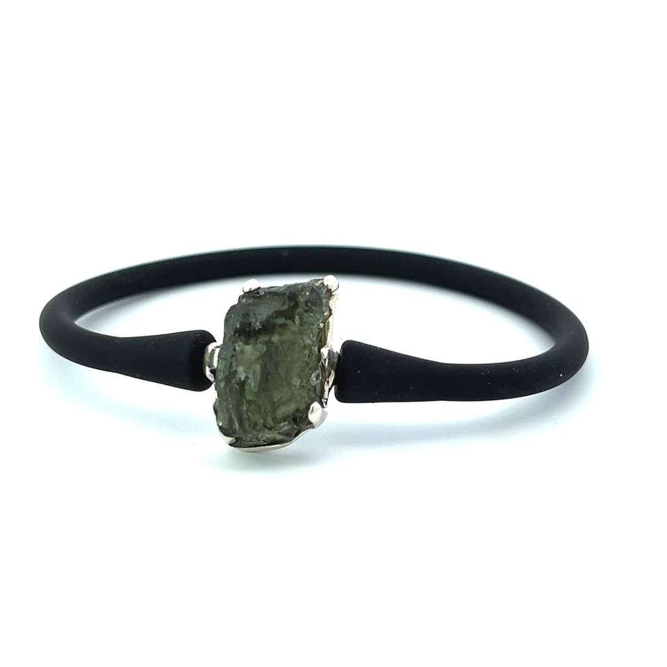 This high vibrational Moldavite (11.3 cts) crystal silicone bracelet has been molded in 925 sterling silver. Stone from Moldau River in Czech Republic. Designed in Sedona, Arizona by Starborn. One size fits most.