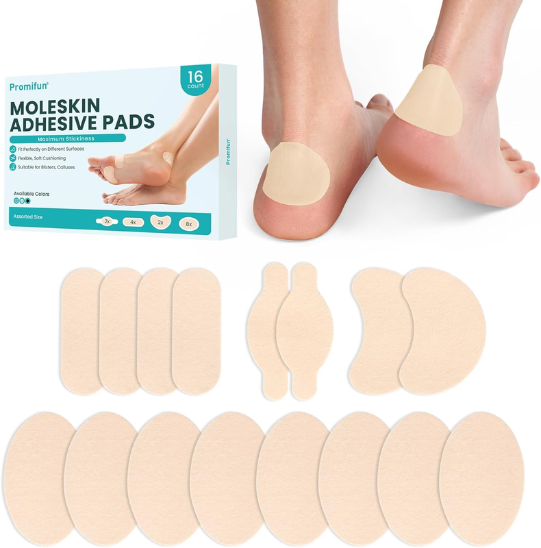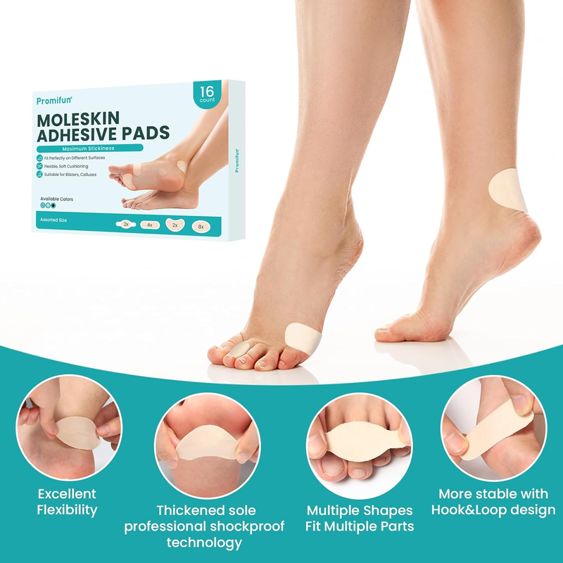 Skin-Friendly Protection - Crafted with breathable moleskin fabric and hypoallergenic adhesive, Promifun moleskin pads are latex-free and gentle on sensitive skin. Pre-cut designs ensure effortless application while maintaining flexibility to conform naturally to your foot contours.