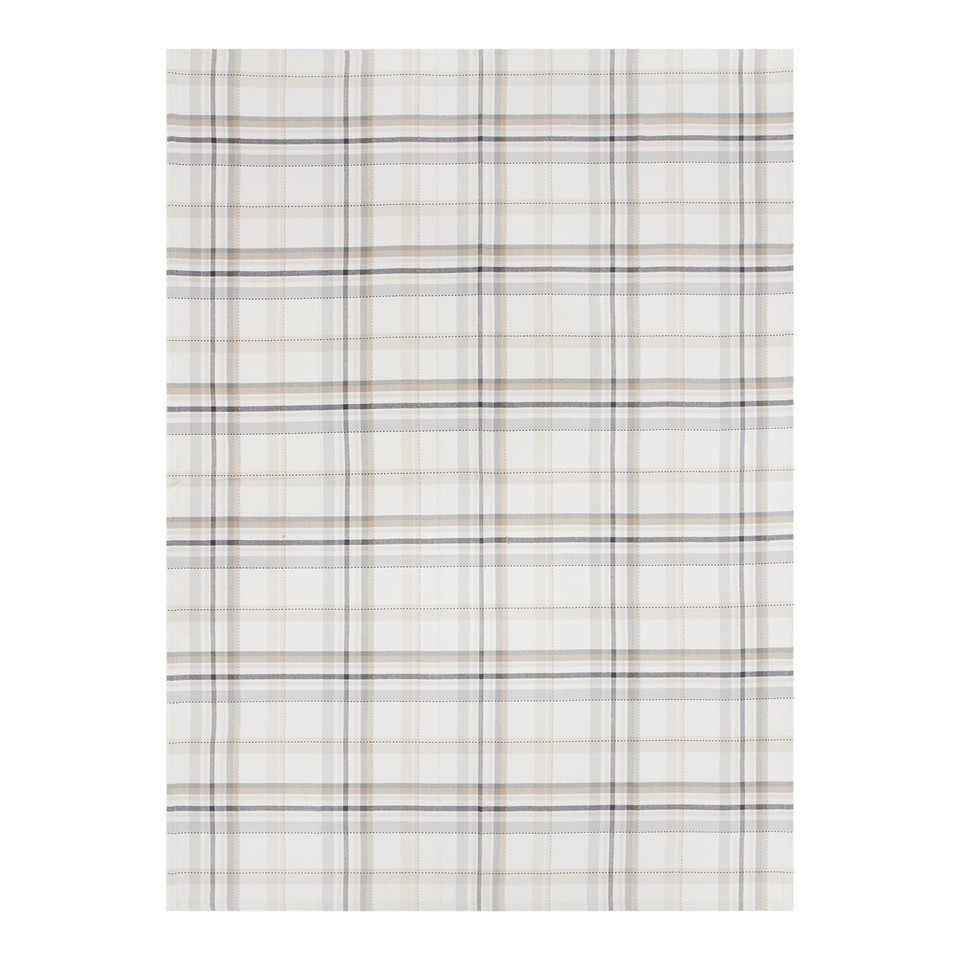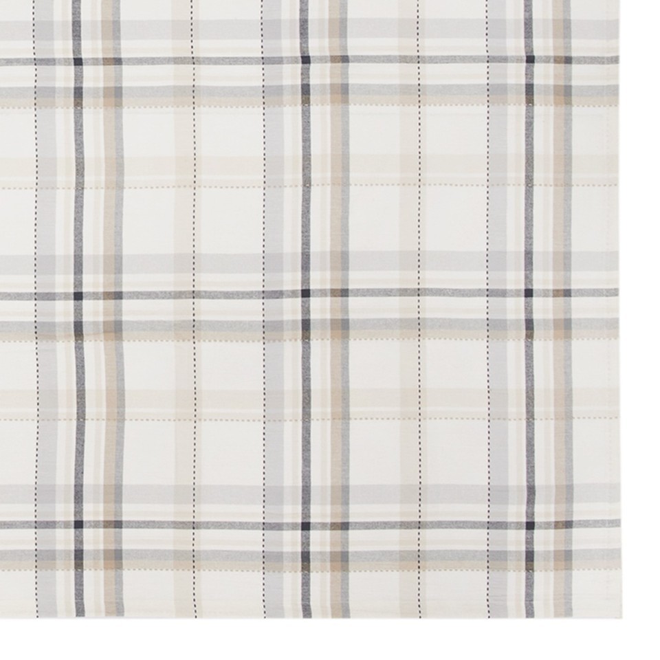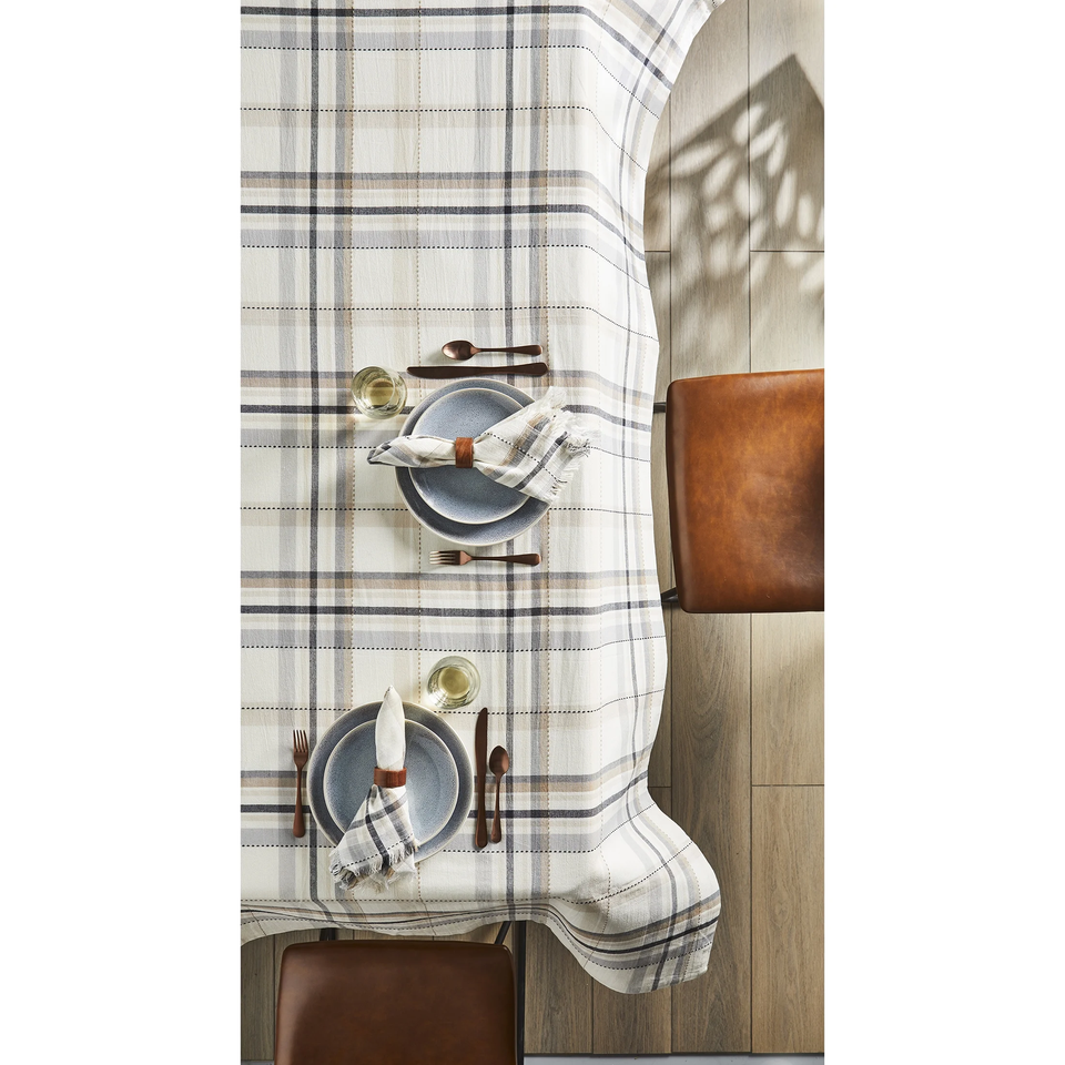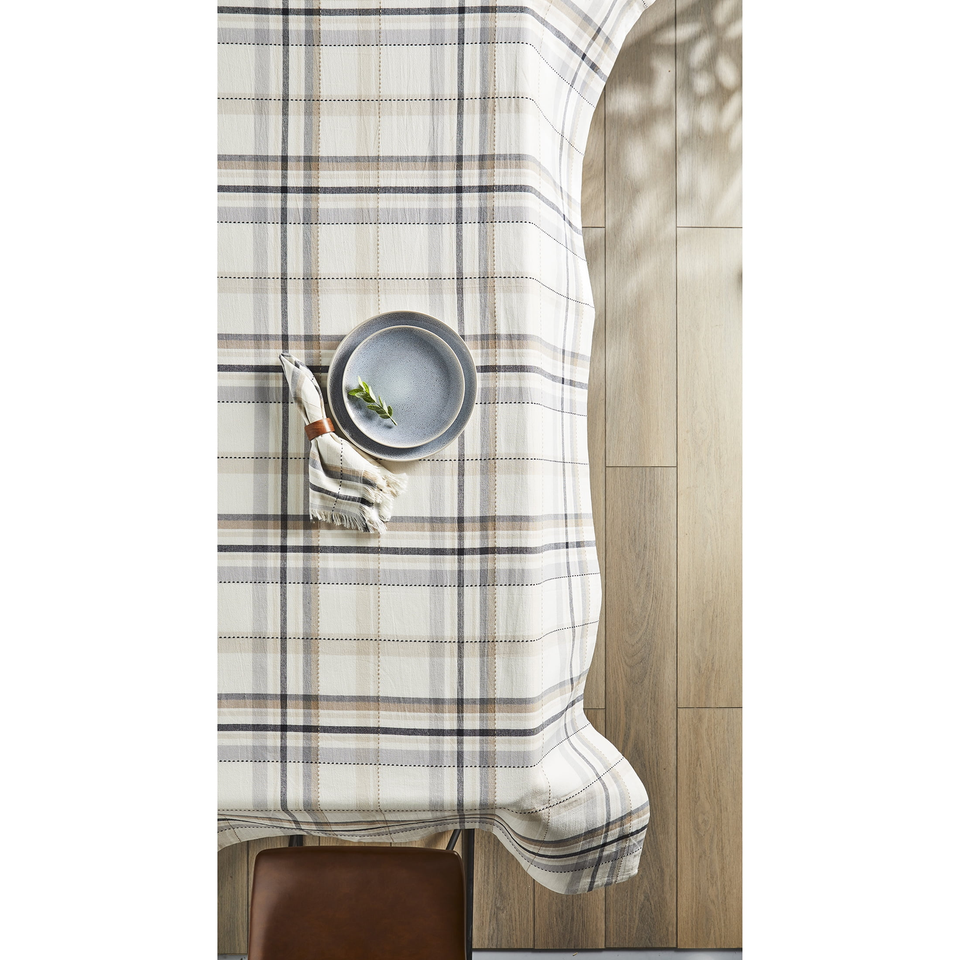 White, grey, black and linen updated plaid design. Protect your tabletop surface. Coordinate with placemats, runner and napkins to create the perfect place setting.