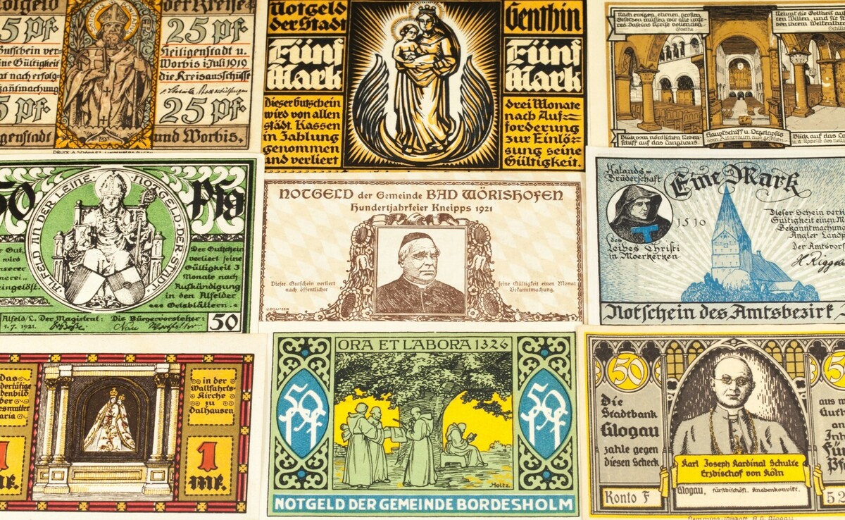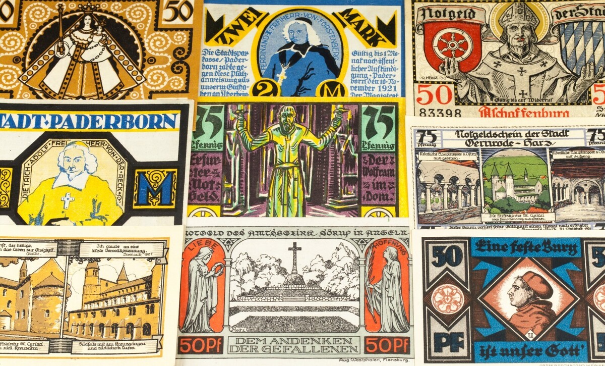 Questo lotto includera 25 note individuali nongeld dalla Germania dopo la prima guerra mondiale. Tutto sara in condizione extra a beneficio (XF-UNC). Valori facciali tra 5 pfennig a 5 marchi. Tema religioso.