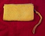 A la venta hay una cartera tipo pulsera de piel de becerro Monserat De Lucca amarilla súper linda. La pulsera tiene un interior negro con herrajes plateados. Cierre con cremallera, ranuras para tarjetas, bolsillos exteriores e interiores con cremallera. Buena condicion. Limpiar por dentro y por fuera con algo de desgaste en los bordes. Mide 7,5" x 4,25"