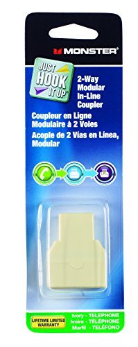 Product description: Monster Cable In-Line Coupler 4 Conductor Modular Ivory Card / "MONSTER" 2-WAY MODULAR IN-LINE COUPLER *4 conductor *Converts a single modular telephone link hook up-line to a dual adapter for a telephone and other phone device(fax machine, etc.) *One end is a single modular jack, other end has two modular jacks *Ivory *Carded