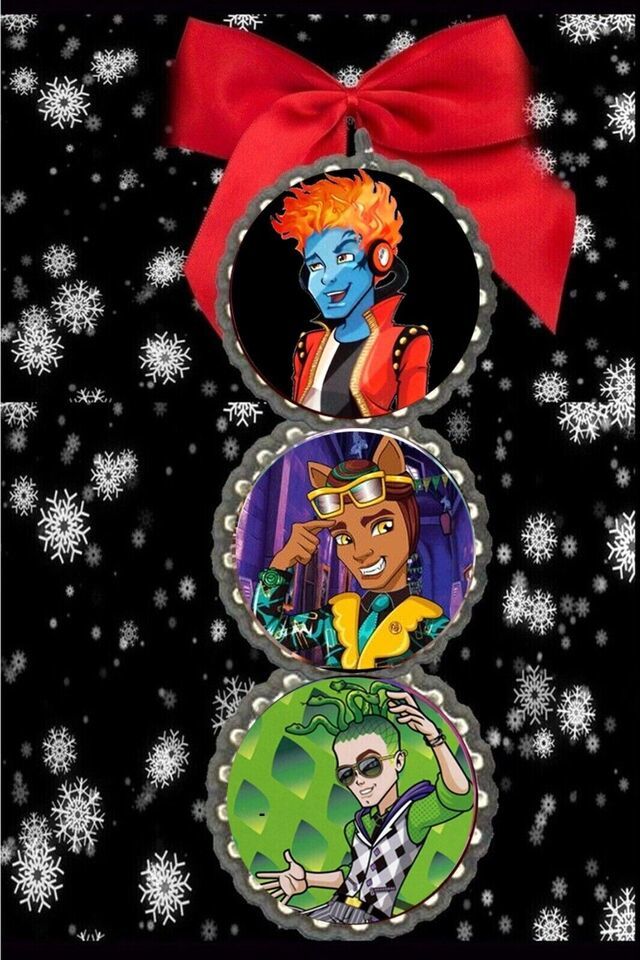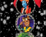 very cool ornament each piece is approx. 1.5 inches round...3 pieces securely attached...lite weight metal pieces....piece of ribbon provided ready for hanging....very clear pictures covered by a dome clear covering hangs approx 4.5 inches long without the ribbon, ribbon adds more length