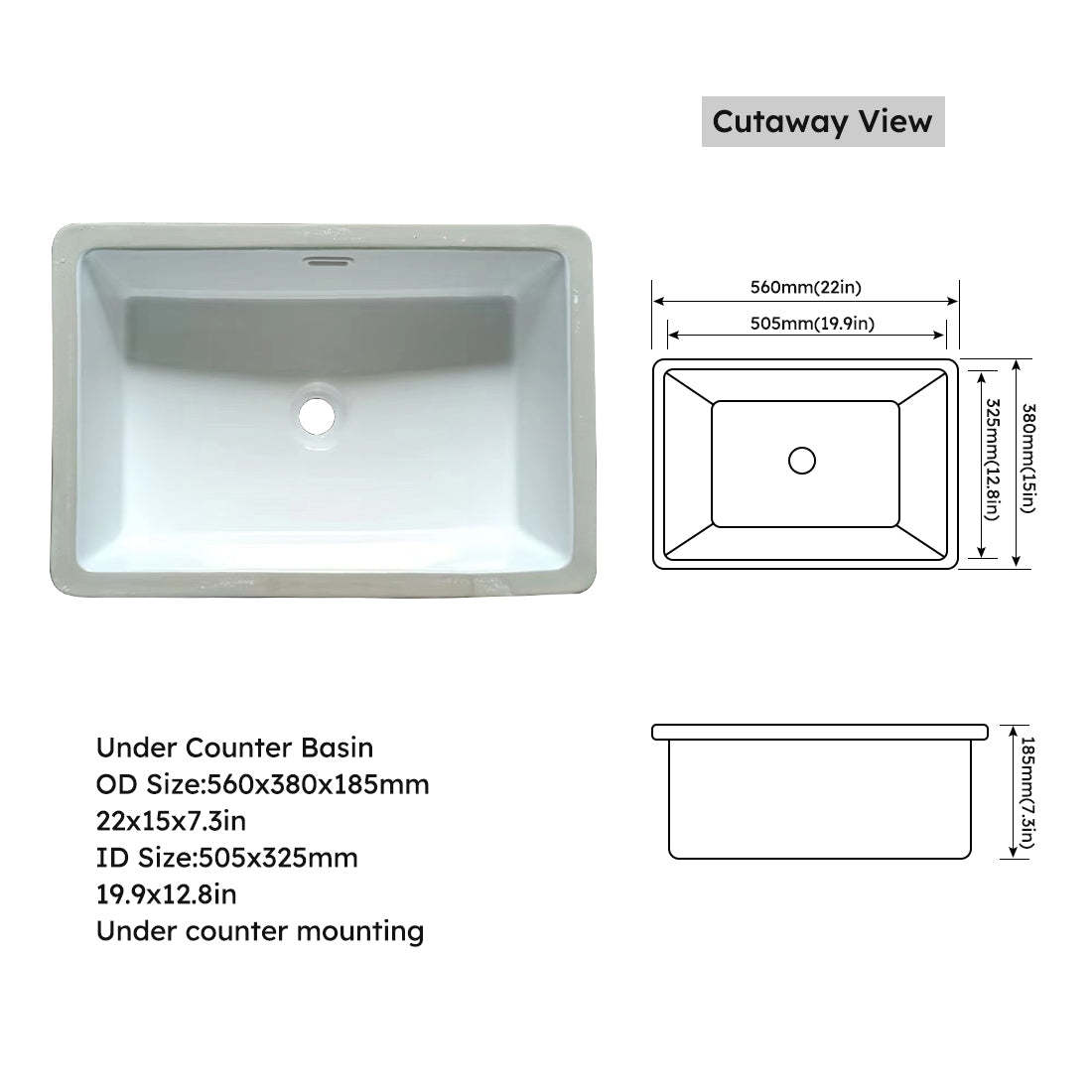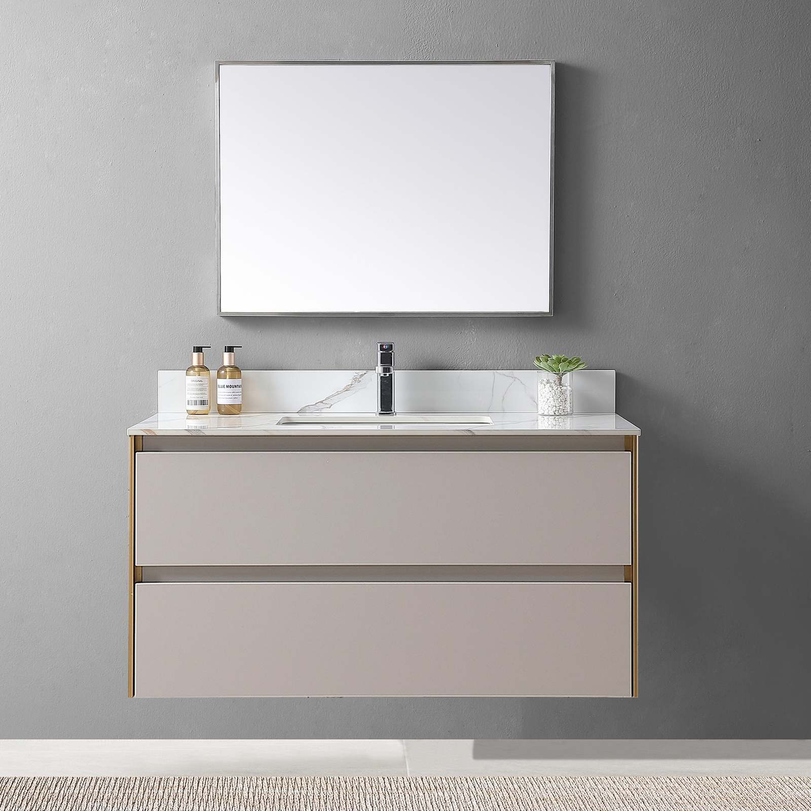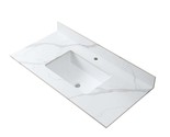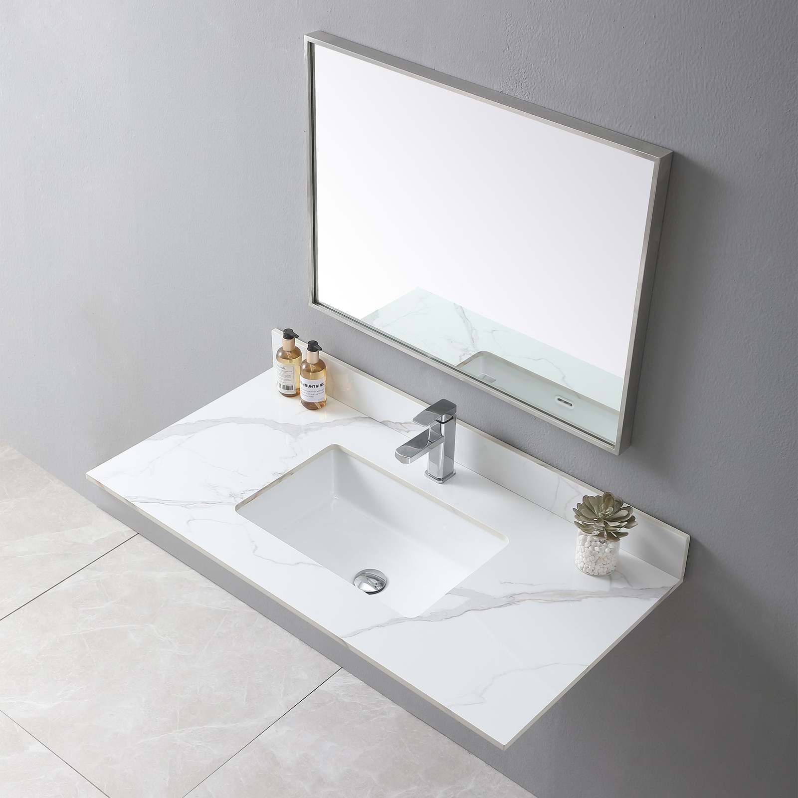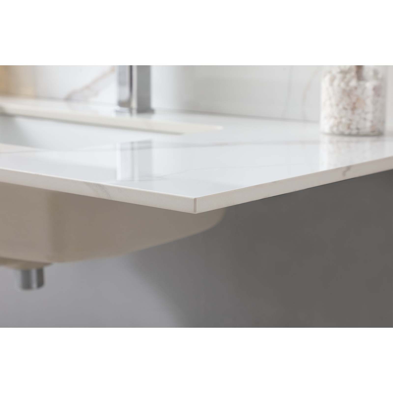 The vanity tops are made of beautiful Sintered stone. All exterior sides are polished for a luxurious look. Each model is complemented with a ceramic Rectangle undermount sink. The matching backsplash is included in each package.