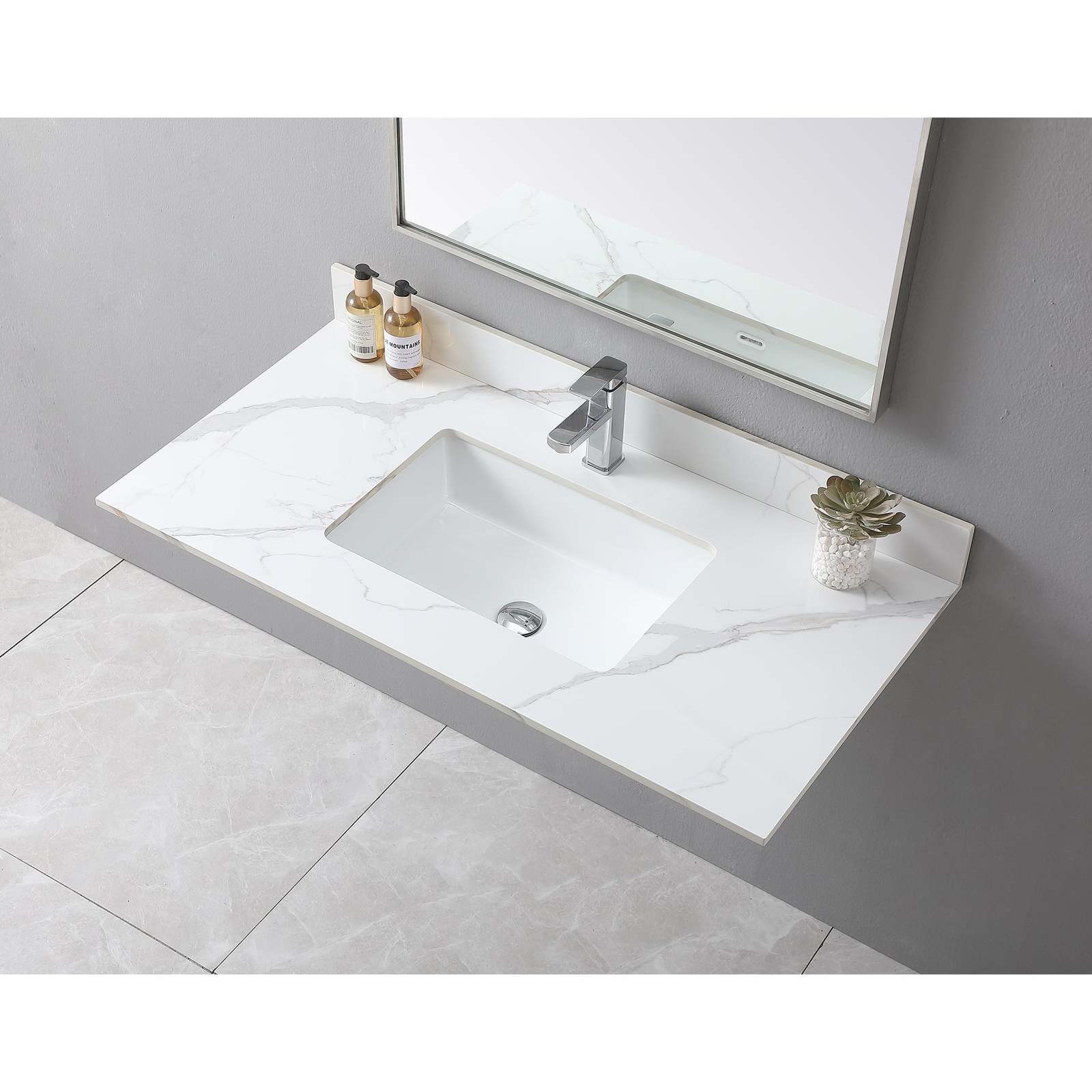 [Easy to Installation] Top pre-drilled for 8-inch widespread faucet Assembled stylish rectangular white vitreous china under mount bowl with safety overflow hole This top is perfect for quick and easy remodels Obtain the beauty and durability of marble without hiring a professional