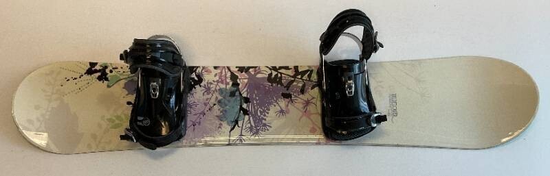 Lightly used Morrow Wildflower 148cm snowboard with strap-in bindings, ideal for beginner to intermediate riders. This all-mountain women?s board features a 2x4 binding mount pattern, padded ankle and toe straps, and a smooth ride profile. The top graphic is clean with minimal wear, and the green base is in excellent shape. A great board for getting into snowboarding or upgrading from rental setups.