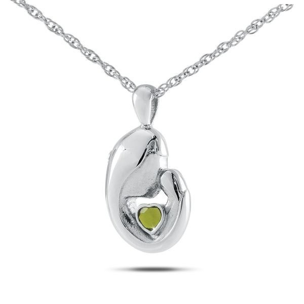 Beautifully designed in silver with a gentle peridot accent for August, this pendant reflects a mother?s loving embrace. It safely holds a small portion of remains, offering families comfort and remembrance.