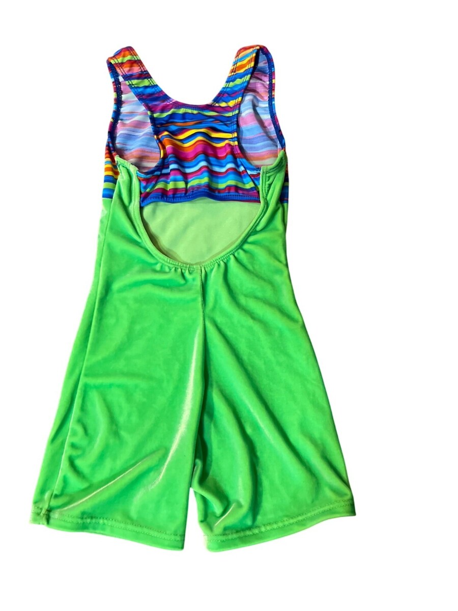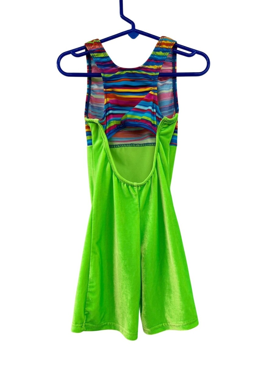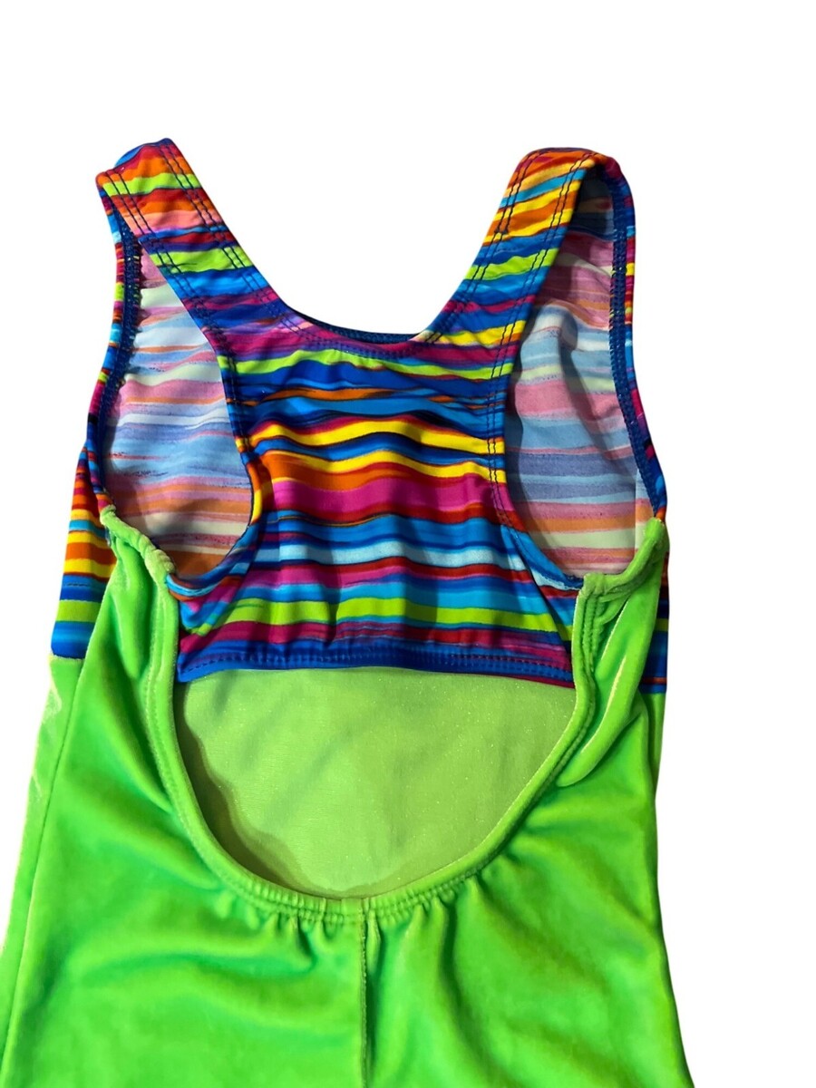 Motionwear Gymnastics Shortall Leotard Girls 8-10 Green Velvet Rainbow Stripe
