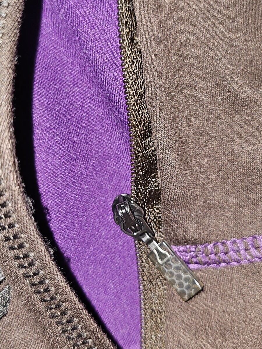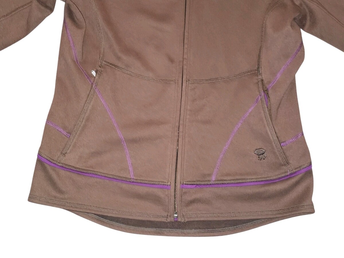 The left zipper pocket is off the track. The Mountain Hardwear Women?s Hooded Jacket is a versatile and stylish option for outdoor activities or casual wear. Made with polyester outer shell material and lined with polyester fleece, this mid-length jacket features a full zip closure, long sleeves, and a hood for added warmth and protection. The brown color and solid pattern make it suitable for various occasions, and the inclusion of accents such as zippers, embroidered logo, and pockets add practicality to the design. Perfect for winter, fall, or spring, this jacket offers a comfortable fit for women in size Large.