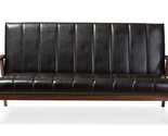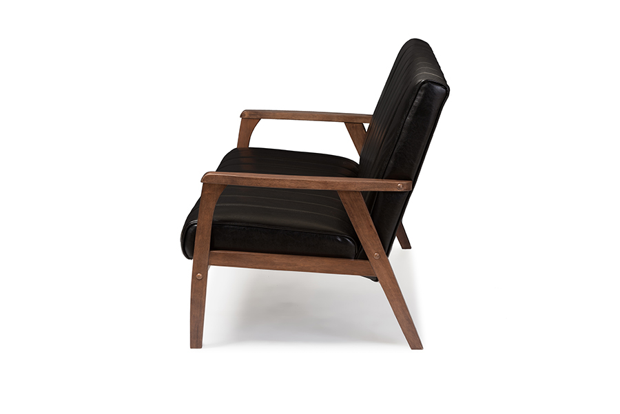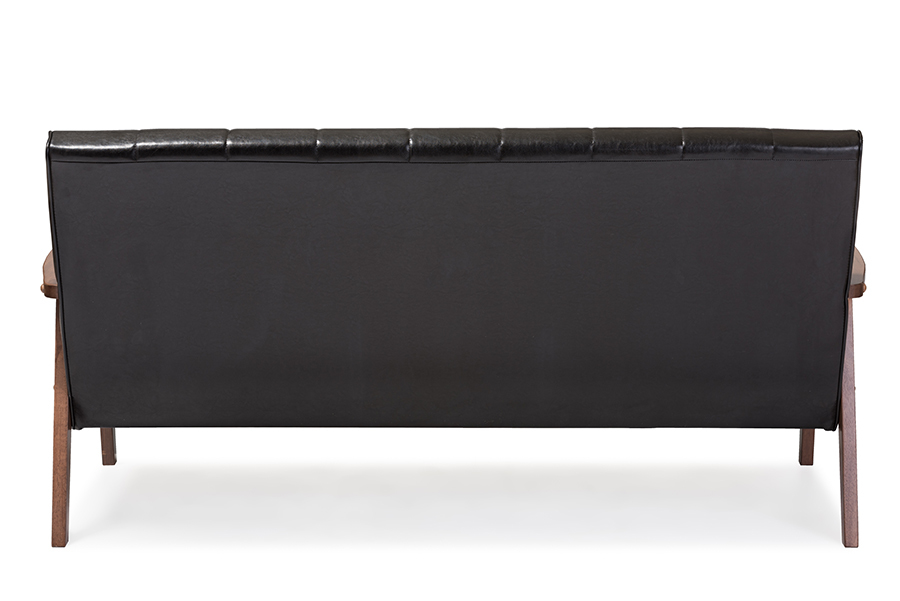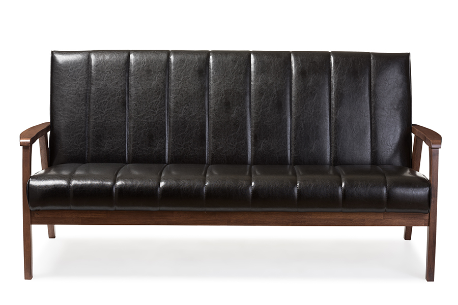 Features: Constructed from rubberwood, MDF wood, and LVL Walnut brown finish Faux leather upholstery with panel stitching Angular wooden frame Versatile Design to Compliment Any Home Decor Solid and Quality Construction Set Includes: One (1) Sofa