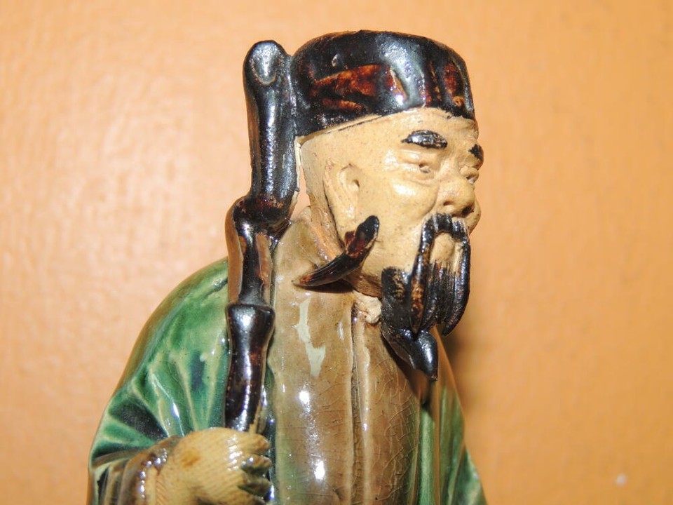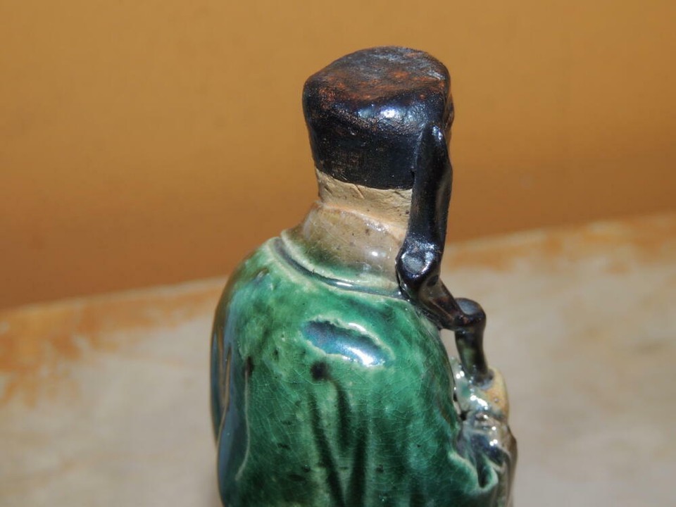 - Mud Man 4.5"+ green brown robe staff Mudman Men Marked China Antique c 1910