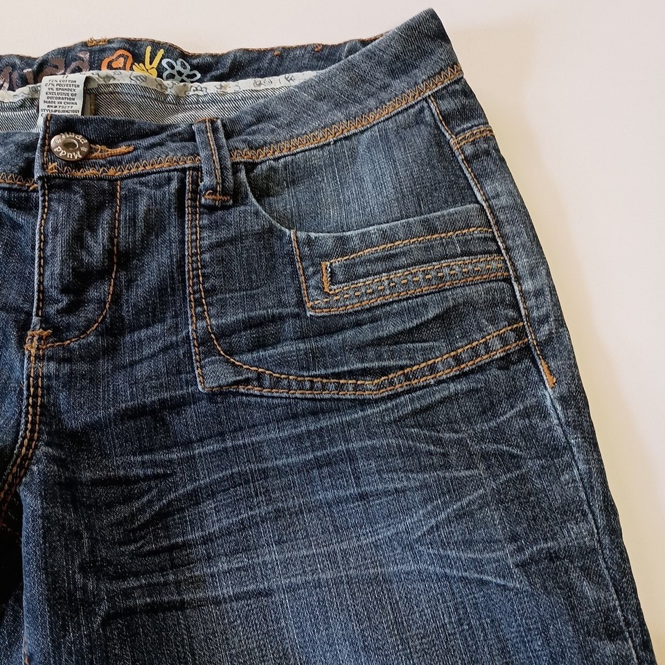 The Mudd Women's/Juniors Denim Blue Capri Folded Hem Jeans in size 11 are a stylish and versatile addition to any casual wardrobe. With a solid pattern, medium wash fabric, and classic button closure, these jeans offer a timeless American style. The folded hem adds a modern twist to the traditional capri length, making them perfect for everyday wear. Made from quality denim fabric, these regular fit jeans by Mudd are comfortable and durable, ideal for long-lasting wear. Normal wear. Missing 1 button on the rear pocket. See pictures.