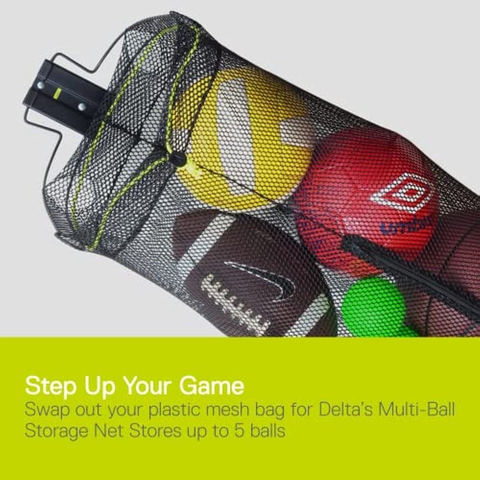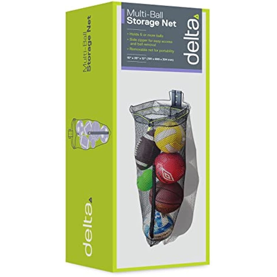 Ditch the plastic mesh bag and step-up your game with delta?s Multi-Ball Storage Net. With a molded steel rim that easily mounts into any wood stud and a flexible stretch net, you can secure and store up to 5 balls with ease. Delta?s drawstring net holds multiple balls for almost any sport, including soccer, baseball, basketball, volleyball and more. For added functionality, hold your other sports gear, or even laundry behind a door! Rip-resistant mesh is durable and will withstand elements on and off the field. The open weave design allows for breathability to drain when wet, and easy viewing of your cargo. Perfect for coaches, players or families alike, this versatile wall-mounted storage net keeps your balls neatly organized in one place. Slide the net off the steel frame and close drawstring for easy transport to and from practice. Side zipper allows for quick access to any individual ball. Delta?s Multi-Ball Storage Net is built for durability and carrying convenience. Store, organize and haul your sports gear, no matter where the coach takes you. Constructed of professional-grade netting, this equipment bag is strong and built to last. This flexible storage solution for sports balls and equipment means your team won?t be waiting for equipment to arrive, and with delta?s limited lifetime warranty, you?ve got next season?s gear covered.
