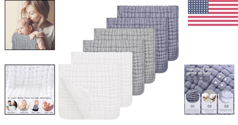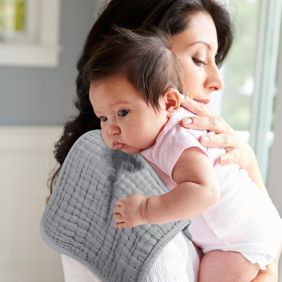 100% Cotton: Made from pure natural muslin cotton, our burp cloths are exceptionally soft, breathable, and skin-friendly, ensuring gentle care against your baby?s delicate skin.