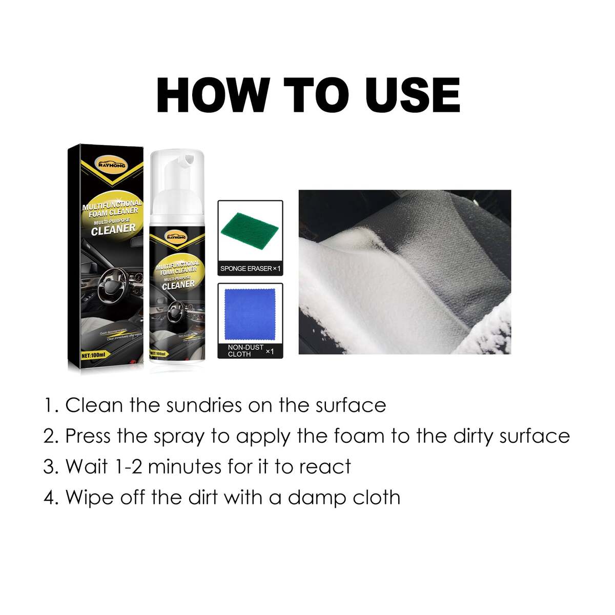 Our car interior cleaner contains deionized water, lemon extract, baking soda. It can clean the interior of the car and remove stubborn dust and rust from the surface without causing any damage to the surface. Its use method is very simple: first clean the debris on the surface, then press the sprayer, apply the foam on the dirty surface, wait 1-2 minutes, let it react, and finally wipe off the dirt with a wet cloth. After use, you can thoroughly clean the interior of the car, remove stubborn stains on the surface, remove odor, and make the interior of the car look new.