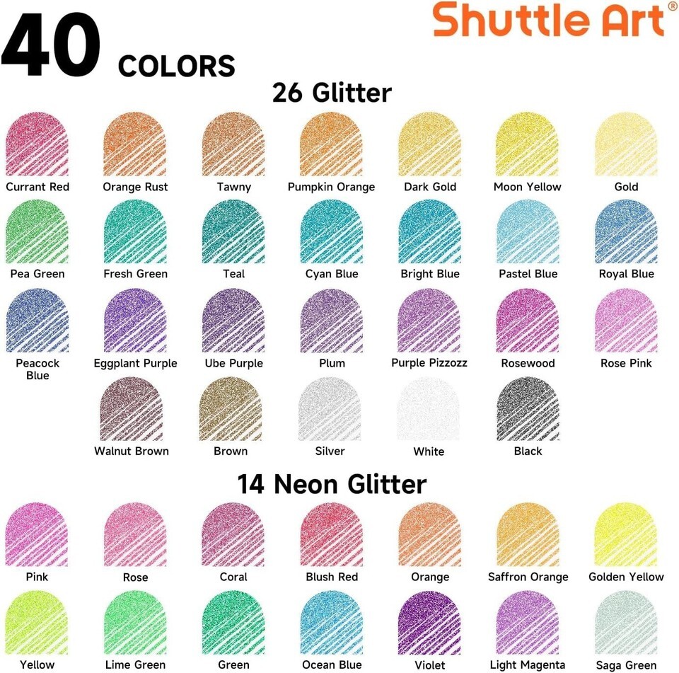 80 Glitter Pack: Contains 40 unique glitter colors, including neon and 40 matched refills to keep your creative juices flowing.