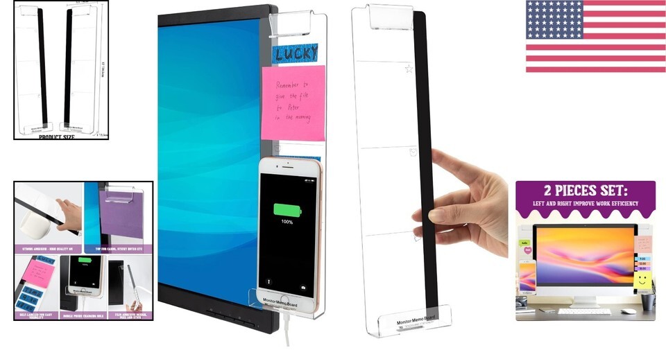 Transform your workspace with our set of two memo boards, ingeniously designed to adhere to the left and right side of your computer monitor. These versatile office accessories not only serve as sticky note holders but also feature clips for business cards and photos at the top, while a convenient desk phone holder at the bottom ensures your essentials are always within reach. Charge your phone as you organize, bringing unparalleled convenience to your daily tasks.