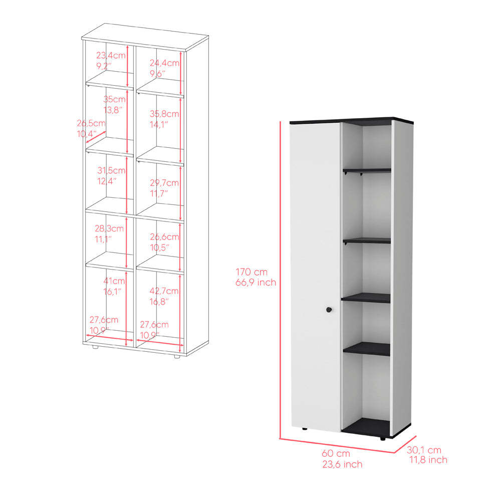 Maximize your kitchen's style and storage with the Kitchen Pantry Lane. This cabinet features black finish shelves of various heights, including 9.2", 11.7", 13.8", and 16.1", to fit all your essentials perfectly. Its sleek white finish and compact design make it the perfect addition to any modern kitchen.