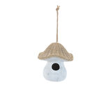 Bring storybook charm to your outdoor space with this Mushroom Birdhouse featuring a trendy wicker-style top. Crafted from polyresin with fabric details, this whimsical birdhouse blends soft white and beige tones with a distressed finish for a rustic yet stylish look. A jute rope hanger adds a natural touch perfect for hanging on a garden stake, porch hook, or tree branch to welcome birds and enchant your guests.