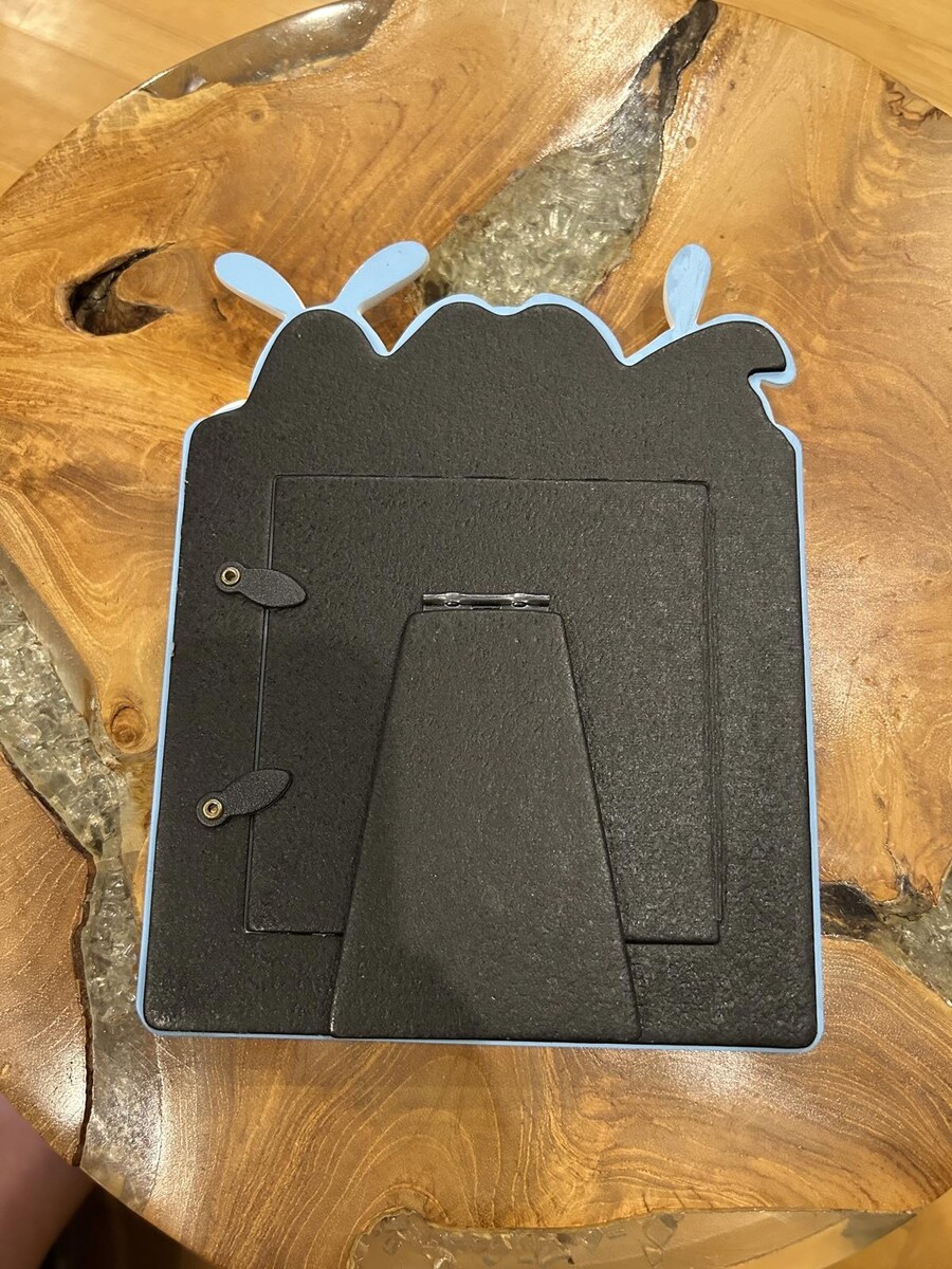 Blue photo frame featuring three cute bunny figures on top.