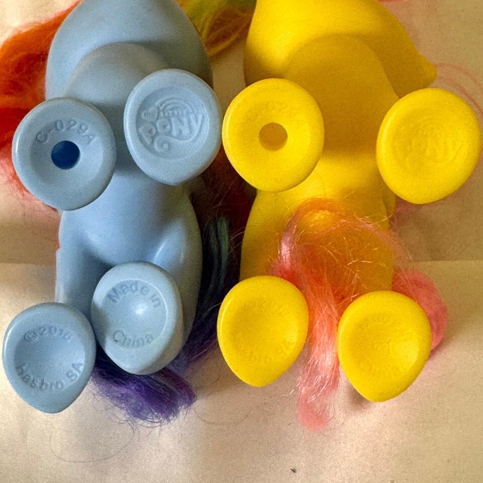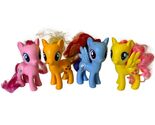 A vibrant set of four authentic My Little Pony: Friendship Is Magic figures from Hasbro's 2016 G4 line ? featuring Pinkie Pie, Applejack, Rainbow Dash, and Fluttershy. Each stands about 6OE? tall with rooted multicolor hair and their signature cutie marks: Pinkie's balloons, Applejack's apples, Dash's lightning bolt, and Fluttershy's butterflies. Genuine mid-G4 brushables, ideal for collectors completing Mane 6 displays or fans of the classic series. Light cosmetic wear ? a few minor surface marks and typical hair frizz from age and handling. Clean overall and display-ready.