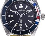 Adjustable 22mm yellow silicone strap fits up to 8-inch wrist circumference Blue dial; date window at 3 o'clock; luminous hands Silver-tone 44mm brass case with fixed black top ring enriched with Nautica style flags spelling "NAUT" Snap down case back; snap-down crown Water resistant to 50m (165 ft): In general, suitable for short periods of recreational swimming, but not diving or snorkeling