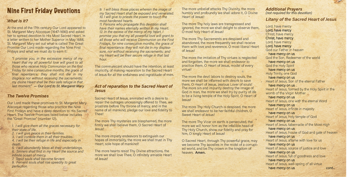 This 4-panel prayer card includes the description of the First Friday Devotions, how to obtain the promises, the steps and associated prayers. Includes bonuses of the Litany of the Sacred Heart of Jesus, Offering to the Sacred Heart of Jesus and the Novena to the Sacred Heart.