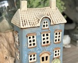 Charming blue and cream glaze, this charming tealight holder features a dormer window, and a pretty floral entrance. It would look lovely when displayed on a shelf or windowsill.