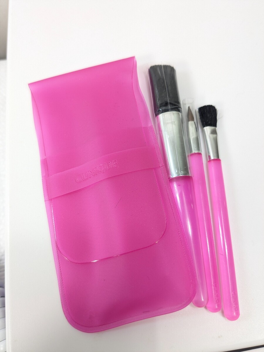 - NEW CLINIQUE travel makeup brush set translucent pink mini brushes plastic case