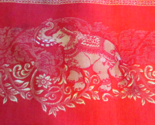 This listing is for a stunning ornate Asian red and gold brocade table runner featuring 8 ornamented elephants surrounded by floral motifs.