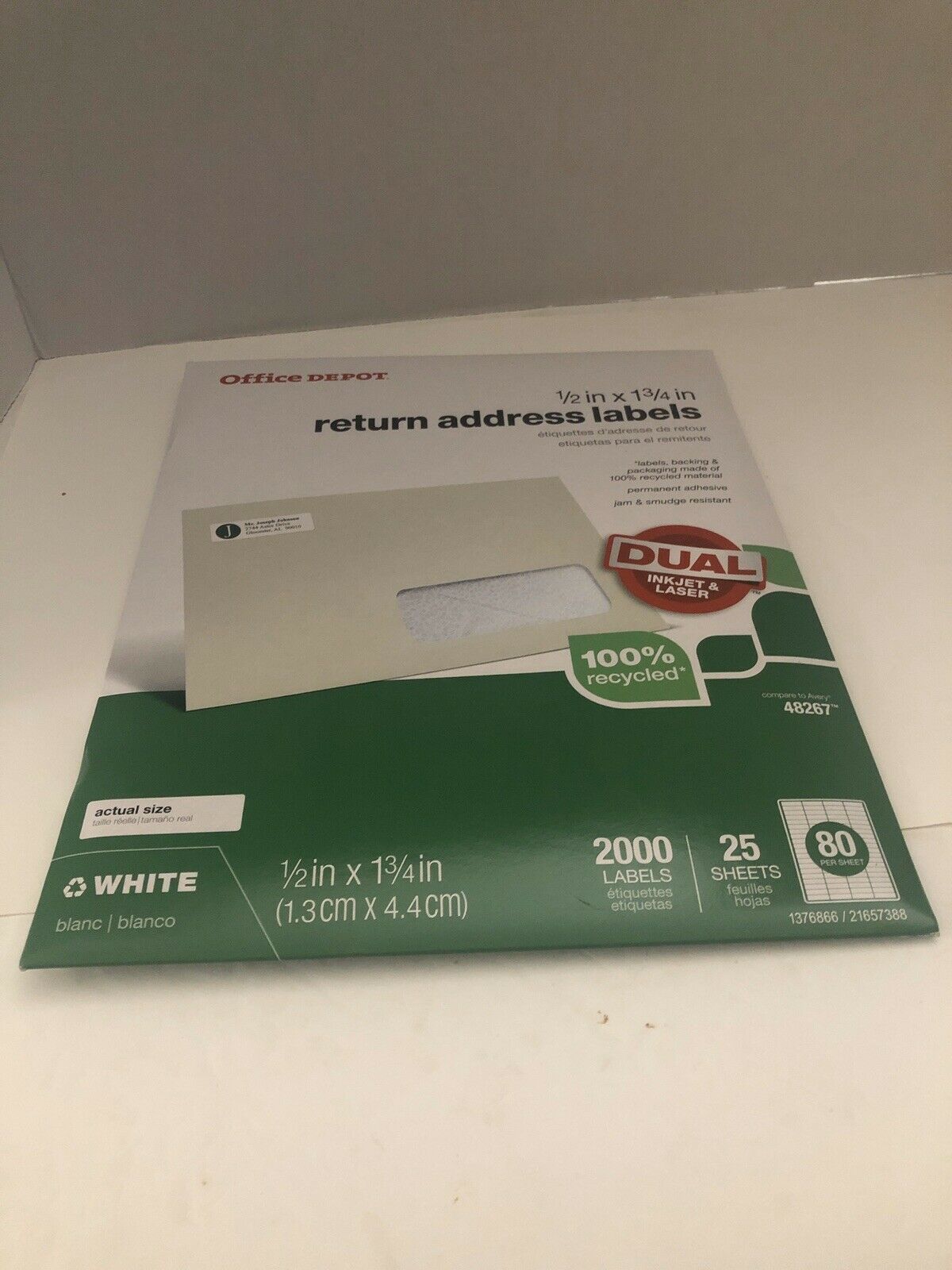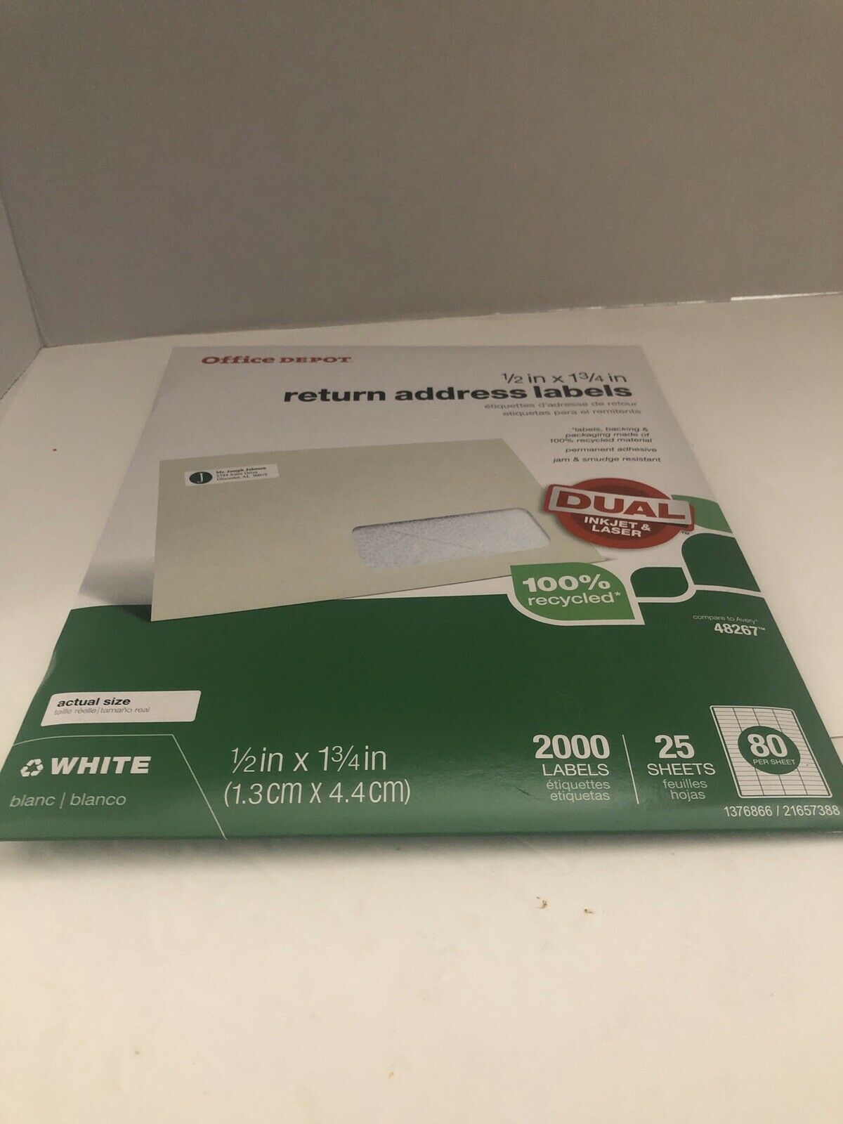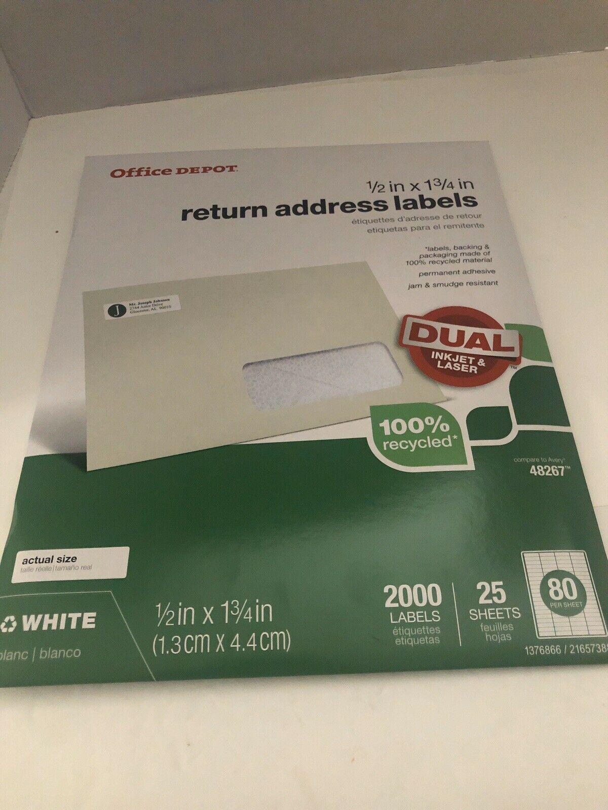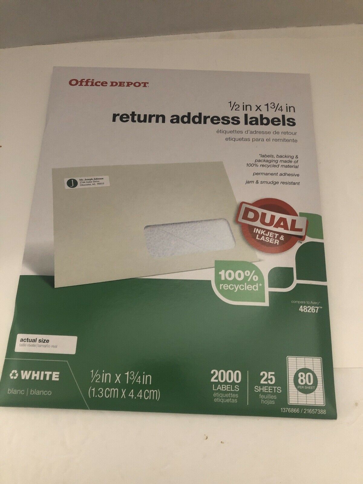 Office Depot Return Address Mailing Label - 1/2" Width x 1 3/4" Length - 2000 per pack (80 labels per sheet x 25 sheets per pack). Compare to Avery 48267. 100% recycled. Dual for Laser or Ink Jet printer.